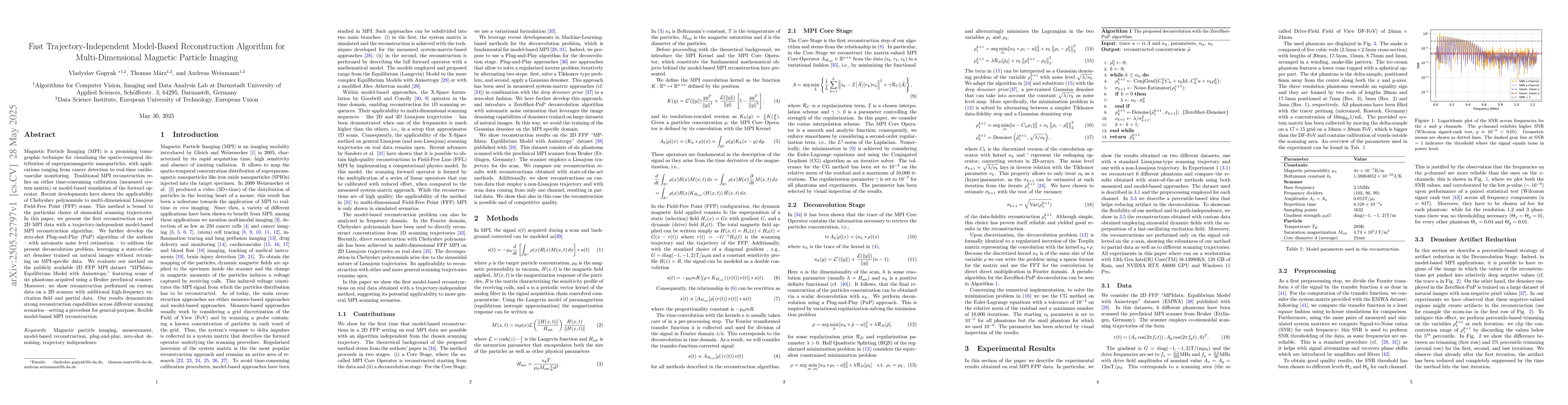 The research introduces a trajectory-independent model-based MPI reconstruction algorithm, utilizing a zero-shot Plug-and-Play (PnP) approach with automatic noise level estimation. It leverages a pre-trained denoiser on natural images, avoiding retraining on MPI-specific data. The method is evaluated on a publicly available 2D FFP MPI dataset and custom data.