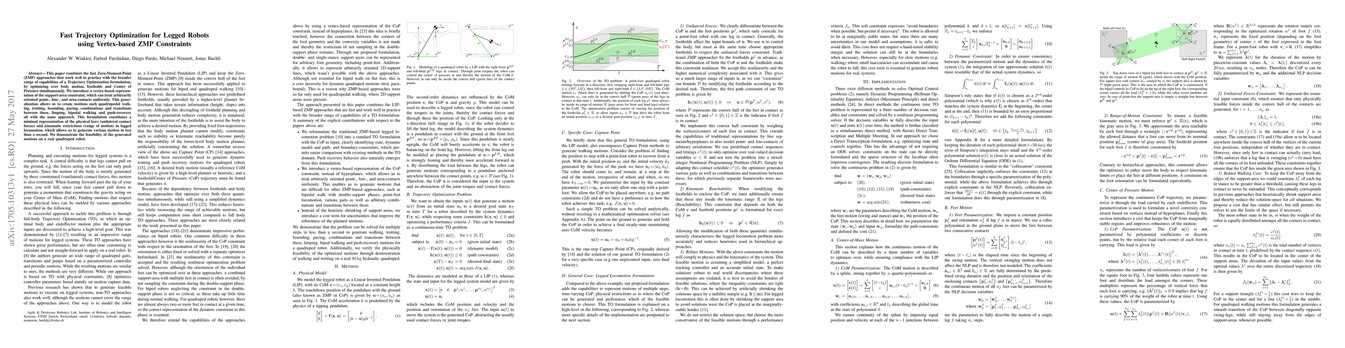 This paper introduces a new approach for legged robots that optimizes movement, footholds, and center of pressure in under 1 second, enabling various motions such as walking, trotting, and push-recovery with minimal representation of physical laws and kinematic restrictions.