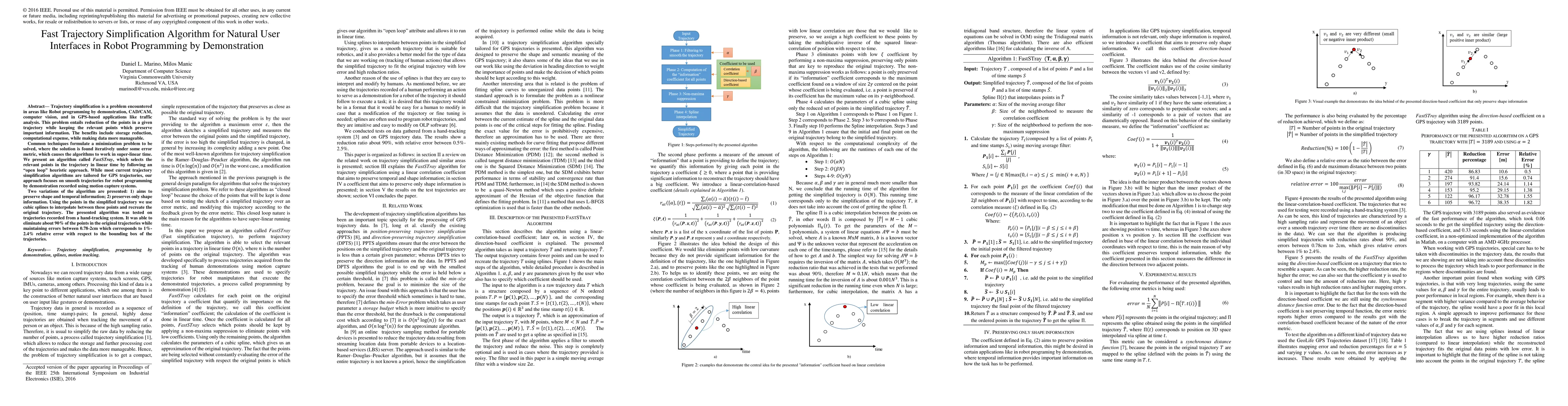 Trajectory simplification is a problem encountered in areas like Robot programming by demonstration, CAD/CAM, computer vision, and in GPS-based applications like traffic analysis. This problem entails reduction of the points in a given trajectory while keeping the relevant points which preserve important information. The benefits include storage reduction, computational expense, while making data more manageable. Common techniques formulate a minimization problem to be solved, where the solution is found iteratively under some error metric, which causes the algorithms to work in super-linear time. We present an algorithm called FastSTray, which selects the relevant points in the trajectory in linear time by following an open loop heuristic approach. While most current trajectory simplification algorithms are tailored for GPS trajectories, our approach focuses on smooth trajectories for robot programming by demonstration recorded using motion capture systems.Two variations of the algorithm are presented: 1. aims to preserve shape and temporal information; 2. preserves only shape information. Using the points in the simplified trajectory we use cubic splines to interpolate between these points and recreate the original trajectory. The presented algorithm was tested on trajectories recorded from a hand-tracking system. It was able to eliminate about 90% of the points in the original trajectories while maintaining errors between 0.78-2cm which corresponds to 1%-2.4% relative error with respect to the bounding box of the trajectories.