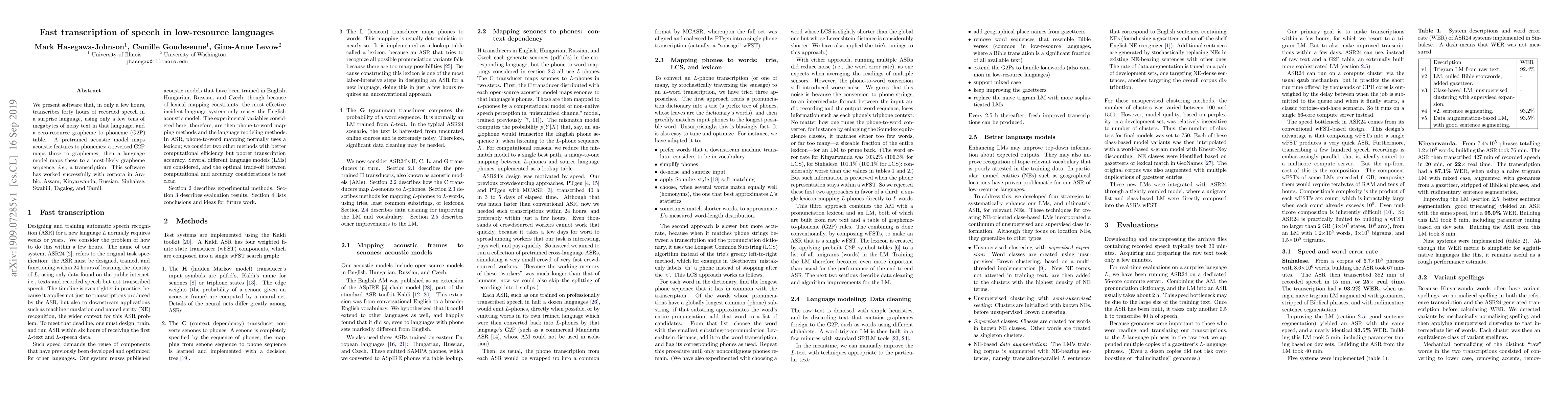 We present software that, in only a few hours, transcribes forty hours of recorded speech in a surprise language, using only a few tens of megabytes of noisy text in that language, and a zero-resource grapheme to phoneme (G2P) table. A pretrained acoustic model maps acoustic features to phonemes; a reversed G2P maps these to graphemes; then a language model maps these to a most-likely grapheme sequence, i.e., a transcription. This software has worked successfully with corpora in Arabic, Assam, Kinyarwanda, Russian, Sinhalese, Swahili, Tagalog, and Tamil.
