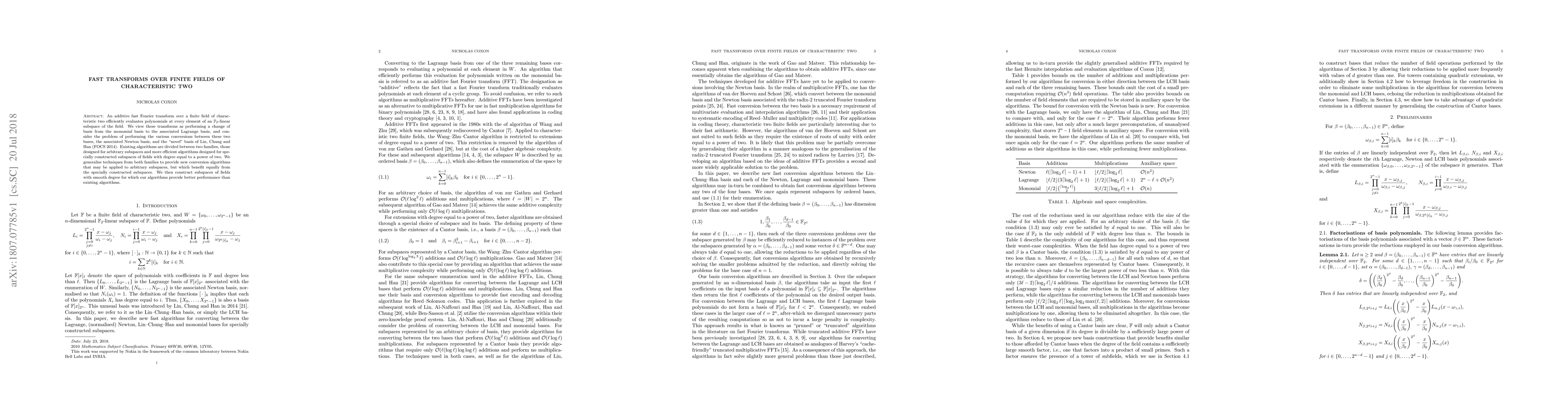 An additive fast Fourier transform over a finite field of characteristic two efficiently evaluates polynomials at every element of an $\mathbb{F}_2$-linear subspace of the field. We view these transforms as performing a change of basis from the monomial basis to the associated Lagrange basis, and consider the problem of performing the various conversions between these two bases, the associated Newton basis, and the '' novel '' basis of Lin, Chung and Han (FOCS 2014). Existing algorithms are divided between two families, those designed for arbitrary subspaces and more efficient algorithms designed for specially constructed subspaces of fields with degree equal to a power of two. We generalise techniques from both families to provide new conversion algorithms that may be applied to arbitrary subspaces, but which benefit equally from the specially constructed subspaces. We then construct subspaces of fields with smooth degree for which our algorithms provide better performance than existing algorithms.