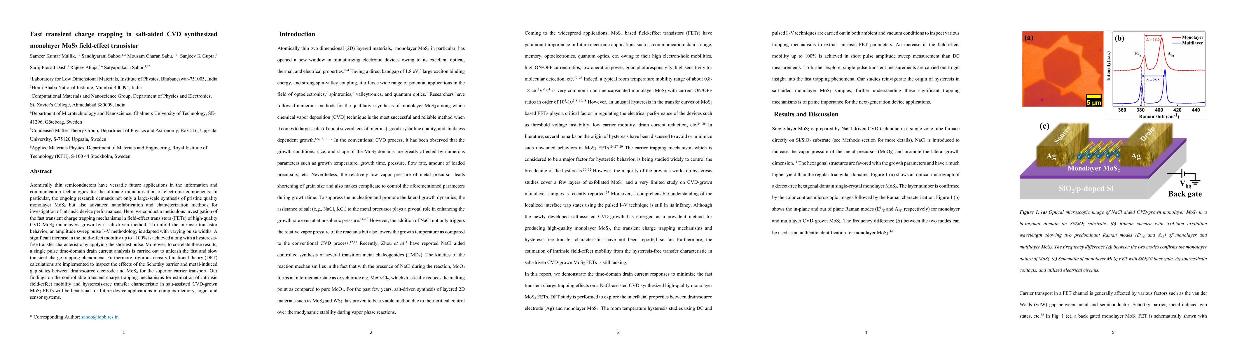 This paper investigates fast transient charge trapping in CVD-synthesized monolayer MoS2 field-effect transistors, achieving a 100% increase in field-effect mobility and hysteresis-free transfer characteristics through pulse methodologies. Density functional theory analyses reveal Schottky barrier and metal-induced gap state effects, highlighting potential for advanced memory, logic, and sensor applications.