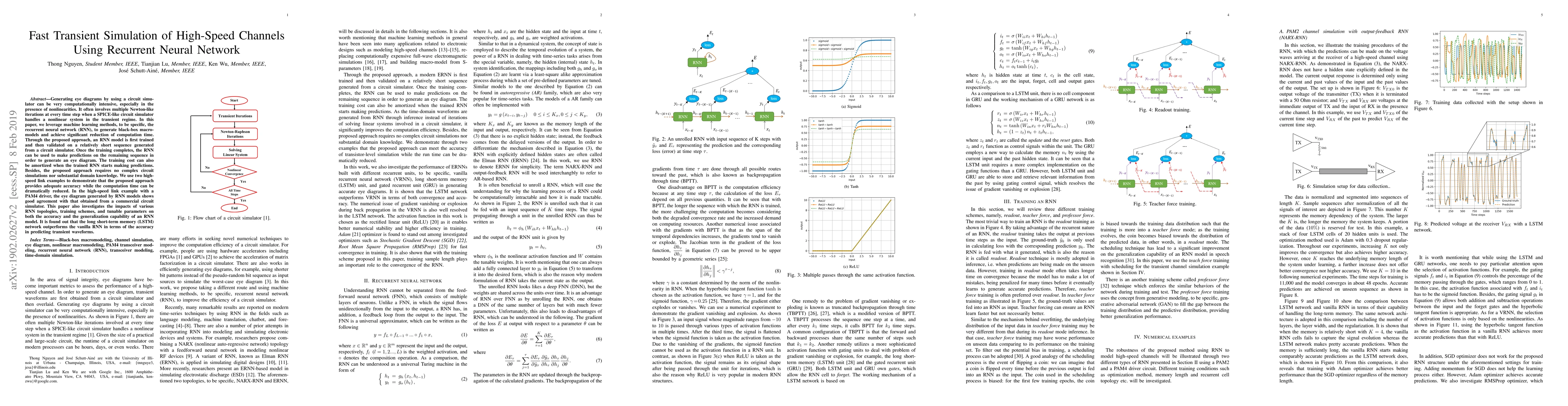 A novel approach uses Recurrent Neural Networks to simulate high-speed channels, reducing computation time by up to 99%, with good accuracy compared to commercial circuit simulators.