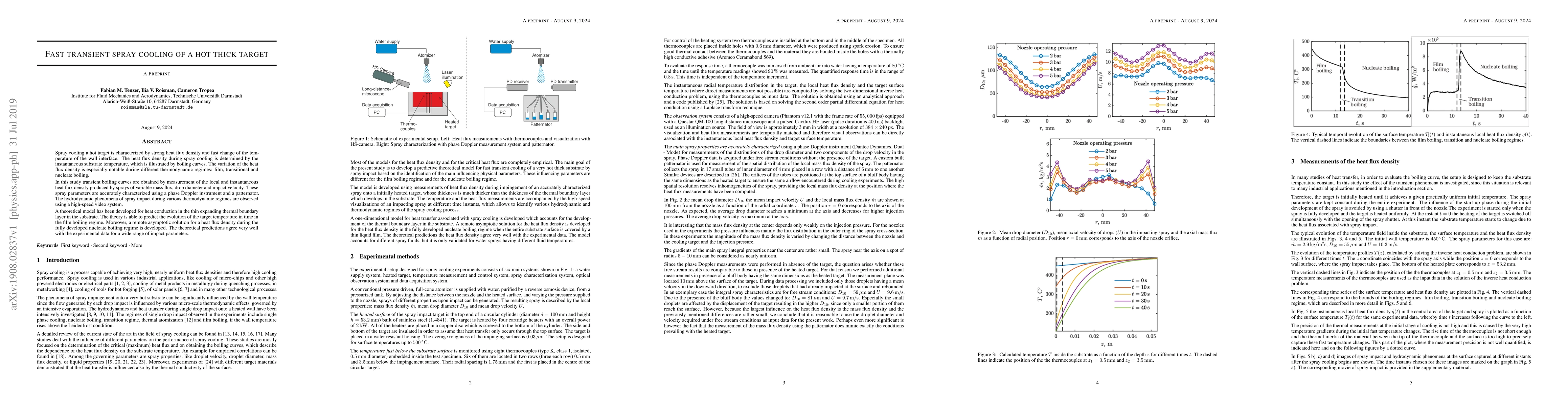 This study investigates transient spray cooling of a hot thick target, focusing on the heat flux density variations during different boiling regimes. Experimental and theoretical methods are used to characterize the impact of spray parameters and predict temperature evolution, with good agreement between predictions and data.
