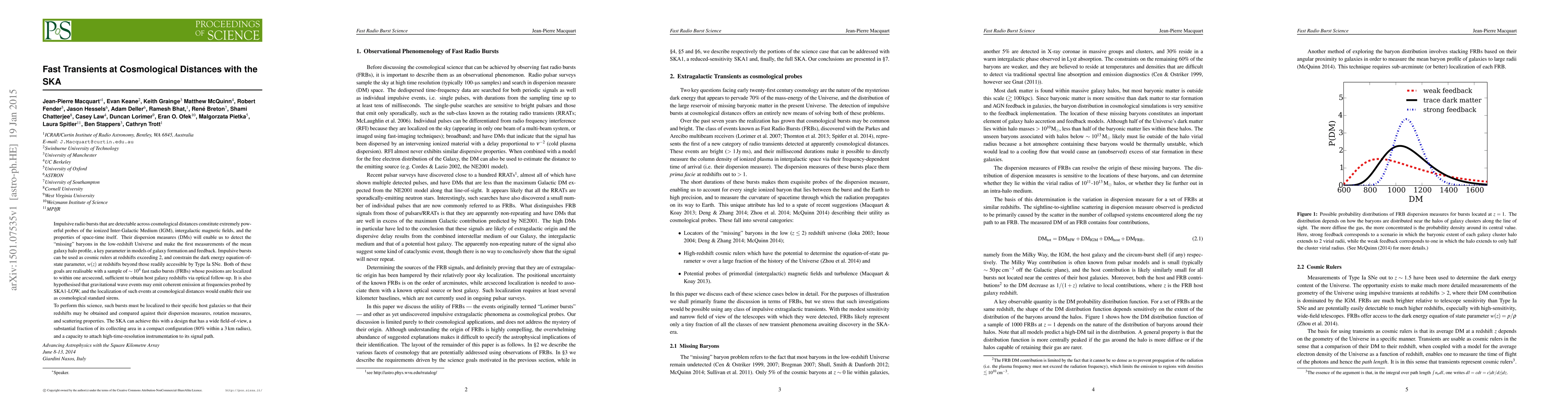 Impulsive radio bursts that are detectable across cosmological distances constitute extremely powerful probes of the ionized Inter-Galactic Medium (IGM), intergalactic magnetic fields, and the properties of space-time itself. Their dispersion measures (DMs) will enable us to detect the "missing" baryons in the low-redshift Universe and make the first measurements of the mean galaxy halo profile, a key parameter in models of galaxy formation and feedback. Impulsive bursts can be used as cosmic rulers at redshifts exceeding 2, and constrain the dark energy equation-of-state parameter, $w(z)$ at redshifts beyond those readily accessible by Type Ia SNe. Both of these goals are realisable with a sample of $\sim 10^4$ fast radio bursts (FRBs) whose positions are localized to within one arcsecond, sufficient to obtain host galaxy redshifts via optical follow-up. It is also hypothesised that gravitational wave events may emit coherent emission at frequencies probed by SKA1-LOW, and the localization of such events at cosmological distances would enable their use as cosmological standard sirens. To perform this science, such bursts must be localized to their specific host galaxies so that their redshifts may be obtained and compared against their dispersion measures, rotation measures, and scattering properties. The SKA can achieve this with a design that has a wide field-of-view, a substantial fraction of its collecting area in a compact configuration (80\% within a 3\,km radius), and a capacity to attach high-time-resolution instrumentation to its signal path.