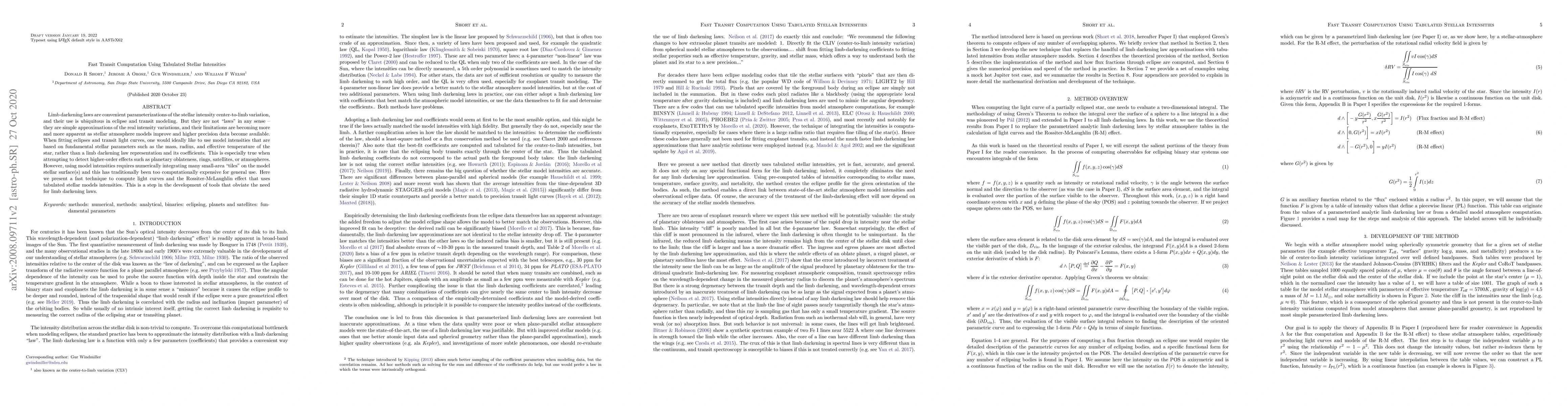 Limb darkening laws are convenient parameterizations of the stellar intensity center-to-limb variation, and their use is ubiquitous in eclipse and transit modeling. But they are not "laws" in any sense -- they are simple approximations of the real intensity variations, and their limitations are becoming more and more apparent as stellar atmosphere models improve and higher precision data become available. When fitting eclipses and transit light curves, one would ideally like to use model intensities that are based on fundamental stellar parameters such as the mass, radius, and effective temperature of the star, rather than a limb darkening law representation and its coefficients. This is especially true when attempting to detect higher-order effects such as planetary oblateness, rings, satellites, or atmospheres. However, using model intensities requires numerically integrating many small-area "tiles" on the model stellar surface(s) and this has traditionally been too computationally expensive for general use. Here we present a fast technique to compute light curves and the Rossiter-McLaughlin effect that uses tabulated stellar models intensities. This is a step in the development of tools that obviate the need for limb darkening laws.