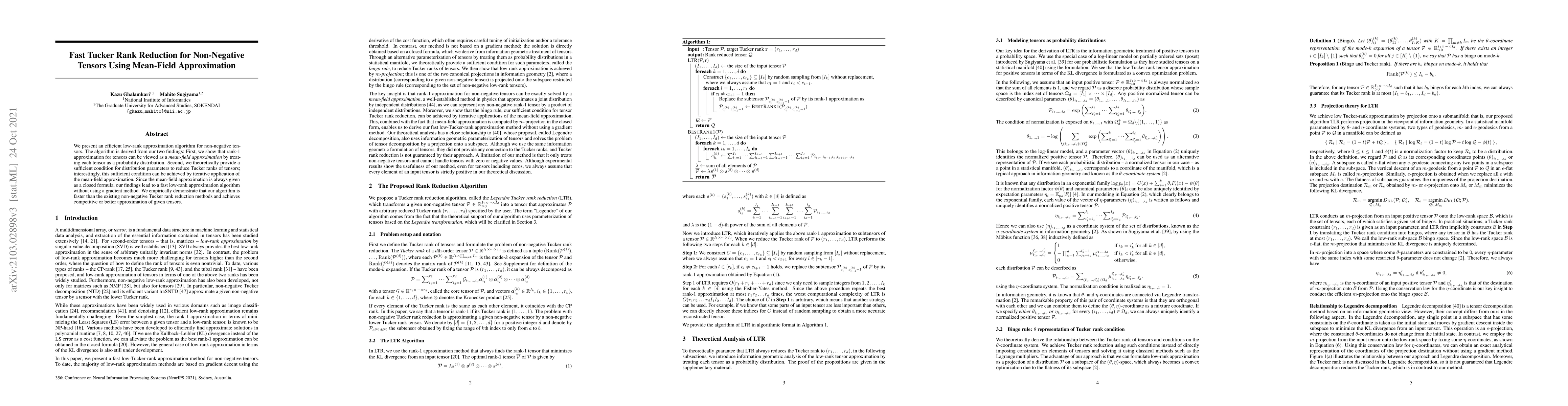 This paper introduces a fast low-rank approximation algorithm for non-negative tensors based on mean-field approximation, treating tensors as probability distributions. The algorithm leverages a closed-form solution for mean-field approximation to achieve faster rank reduction compared to existing methods.