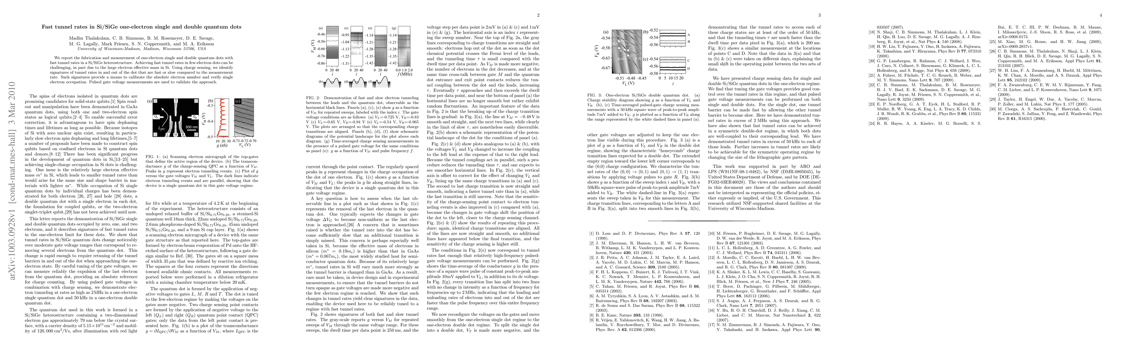 This paper details the fabrication and measurement of one-electron single and double quantum dots in a Si/SiGe heterostructure with notably fast tunnel rates, overcoming challenges posed by silicon's large electron effective mass. The study employs charge sensing to identify tunnel rate signatures and uses pulsed gate voltage measurements to validate the approach.