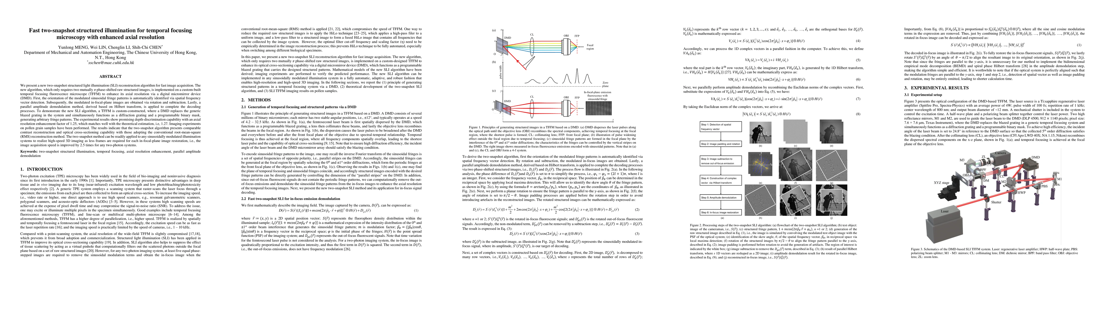 We present a new two-snapshot structured light illumination (SLI) reconstruction algorithm for fast image acquisition. The new algorithm, which only requires two mutually {\pi} phase-shifted raw structured images, is implemented on a custom-built temporal focusing fluorescence microscope (TFFM) to enhance its axial resolution via a digital micromirror device (DMD). First, the orientation of the modulated sinusoidal fringe patterns is automatically identified via spatial frequency vector detection. Subsequently, the modulated in-focal-plane images are obtained via rotation and subtraction. Lastly, a parallel amplitude demodulation method, derived based on Hilbert transform, is applied to complete the decoding processes. To demonstrate the new SLI algorithm, a TFFM is custom-constructed, where a DMD replaces the generic blazed grating in the system and simultaneously functions as a diffraction grating and a programmable binary mask, generating arbitrary fringe patterns. The experimental results show promising depth-discrimination capability with an axial resolution enhancement factor of 1.25, which matches well with the theoretical estimation, i.e, 1.27. Imaging experiments on pollen grain samples have been performed. The results indicate that the two-snapshot algorithm presents comparable contrast reconstruction and optical cross-sectioning capability with those adopting the conventional root-mean-square (RMS) reconstruction method. The two-snapshot method can be readily applied to any sinusoidally modulated illumination systems to realize high-speed 3D imaging as less frames are required for each in-focal-plane image restoration, i.e., the image acquisition speed is improved by 2.5 times for any two-photon systems.