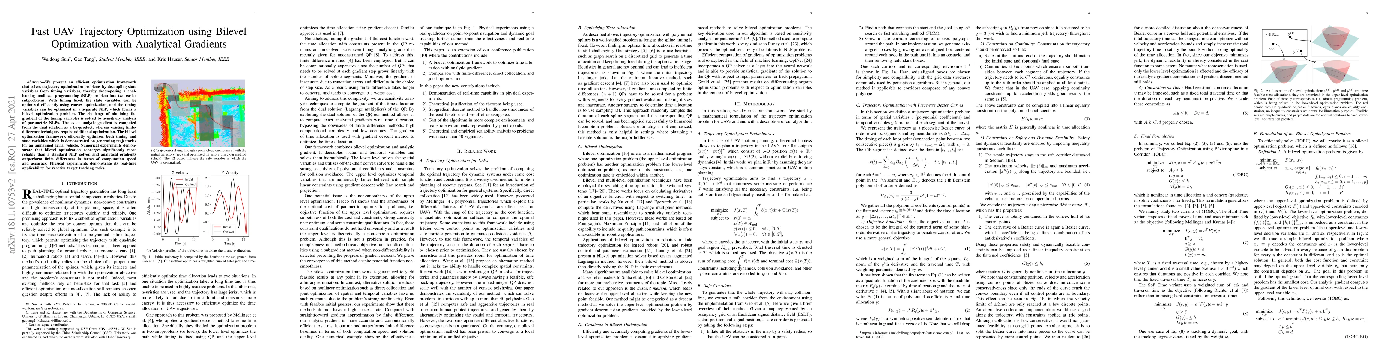 This paper proposes a bilevel optimization framework for fast UAV trajectory optimization by decoupling state and timing variables, solving state variables via convex optimization and timing variables through a separate NLP. Analytical gradients enhance optimization efficiency, outperforming finite-difference methods in speed and accuracy, and demonstrating real-time applicability for reactive target tracking.