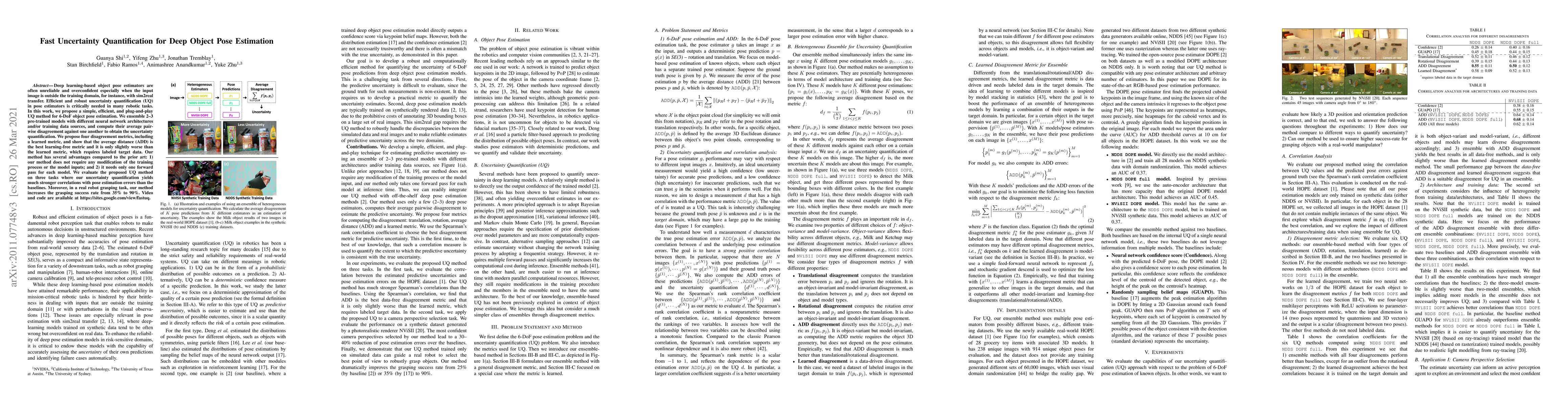 This paper presents an efficient uncertainty quantification method for deep object pose estimation, employing an ensemble of pre-trained models to compute average pairwise disagreement for uncertainty. The proposed method significantly improves grasping success rates in real-world robotic tasks.