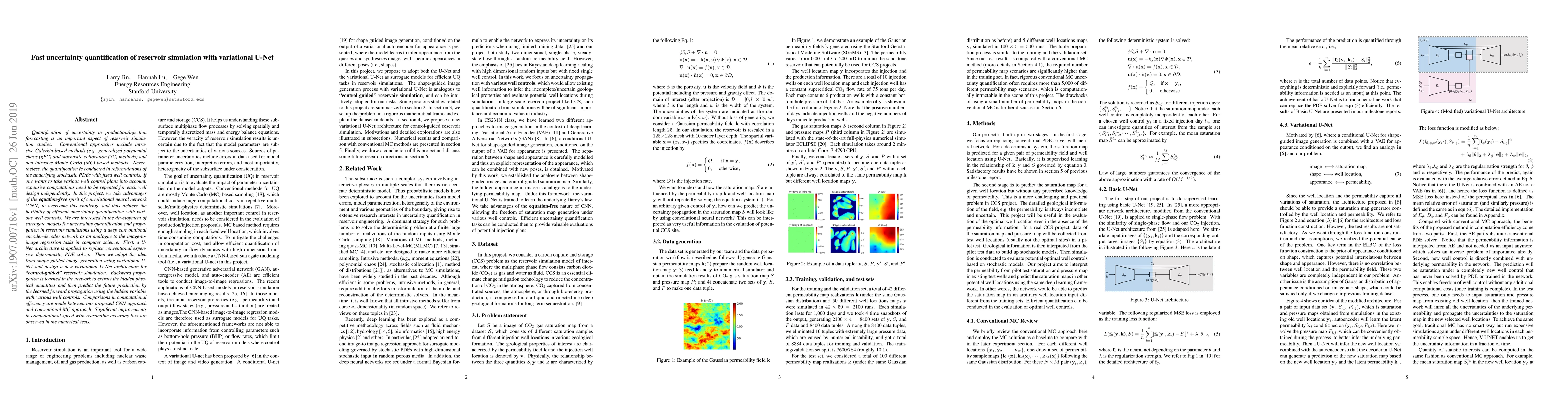 This paper proposes a variational U-Net architecture for fast uncertainty quantification in reservoir simulation, replacing traditional PDE solvers. The method leverages convolutional neural networks for efficient uncertainty propagation under various well control plans, significantly improving computational speed compared to Monte Carlo methods.