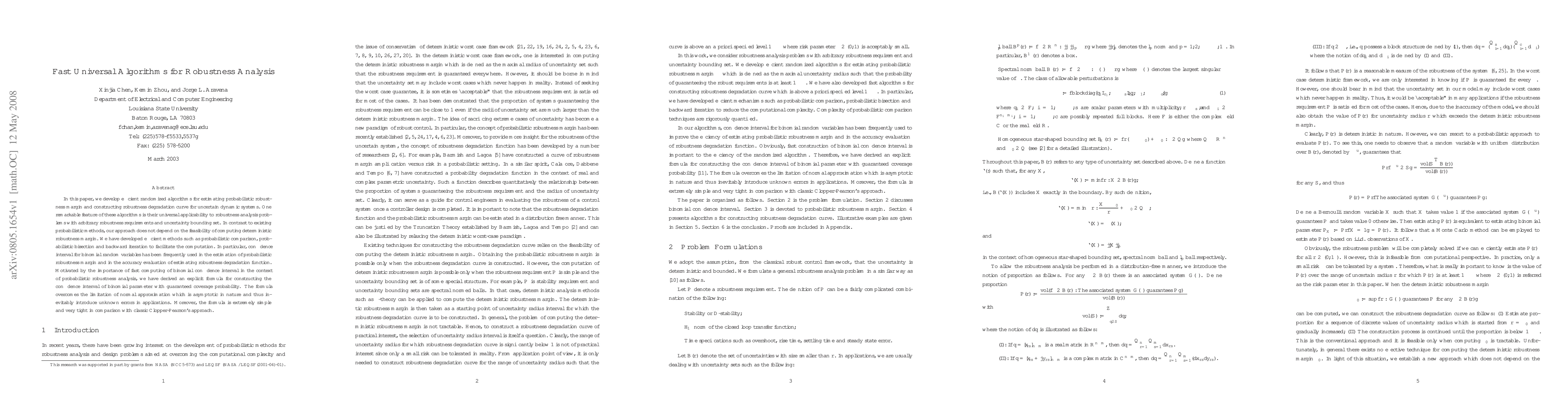 In this paper, we develop efficient randomized algorithms for estimating probabilistic robustness margin and constructing robustness degradation curve for uncertain dynamic systems. One remarkable feature of these algorithms is their universal applicability to robustness analysis problems with arbitrary robustness requirements and uncertainty bounding set. In contrast to existing probabilistic methods, our approach does not depend on the feasibility of computing deterministic robustness margin. We have developed efficient methods such as probabilistic comparison, probabilistic bisection and backward iteration to facilitate the computation. In particular, confidence interval for binomial random variables has been frequently used in the estimation of probabilistic robustness margin and in the accuracy evaluation of estimating robustness degradation function. Motivated by the importance of fast computing of binomial confidence interval in the context of probabilistic robustness analysis, we have derived an explicit formula for constructing the confidence interval of binomial parameter with guaranteed coverage probability. The formula overcomes the limitation of normal approximation which is asymptotic in nature and thus inevitably introduce unknown errors in applications. Moreover, the formula is extremely simple and very tight in comparison with classic Clopper-Pearson's approach.