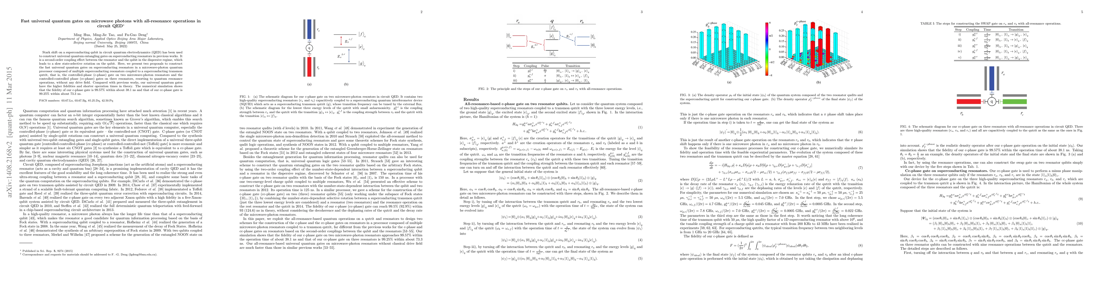 This paper proposes two fast universal quantum gates—controlled-phase and controlled-controlled phase—on microwave photons using superconducting qubits in circuit QED, achieving higher fidelity and shorter operation times compared to previous methods through all-resonance operations without drive fields. Simulation results show fidelities of 99.57% and 99.25% for the c-phase and cc-phase gates, respectively.