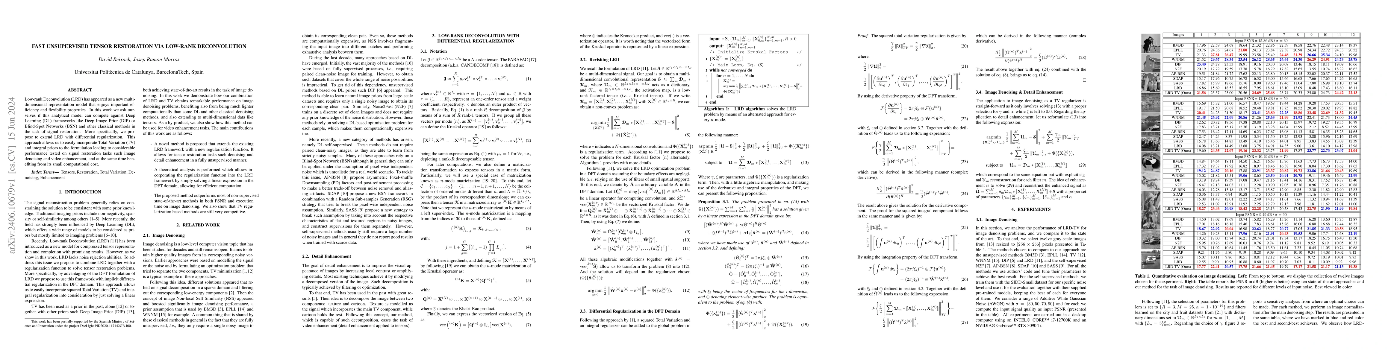 This paper proposes extending Low-rank Deconvolution (LRD) with differential regularization to incorporate Total Variation and integral priors, showing competitive performance in signal restoration tasks like image denoising and video enhancement, while maintaining a low computational cost. The method aims to rival Deep Learning frameworks in efficiency and flexibility.
