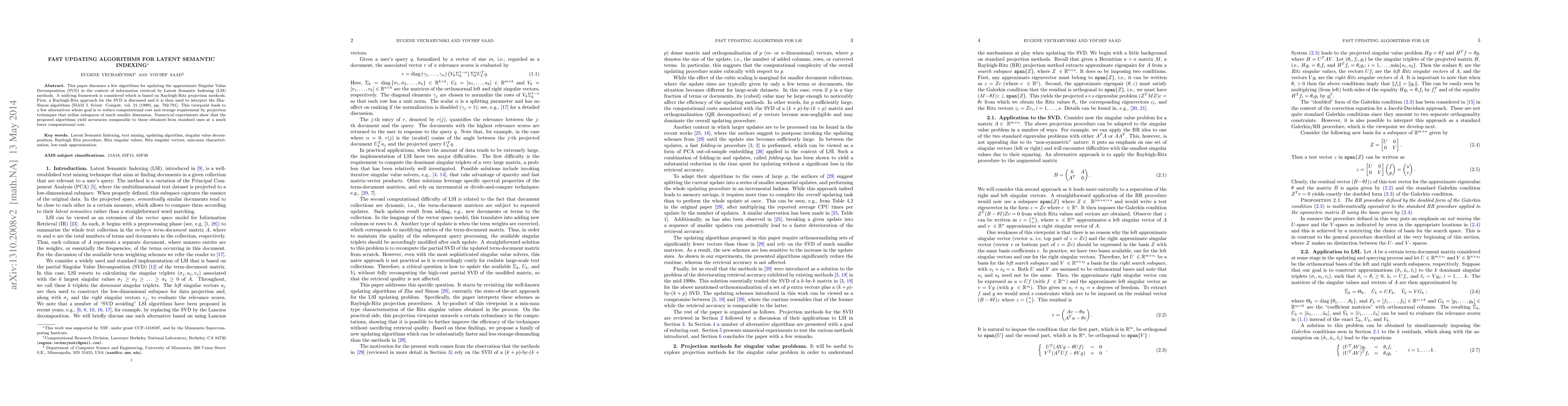 This paper proposes fast updating algorithms for Latent Semantic Indexing (LSI) based on Rayleigh-Ritz projection methods, aiming to reduce computational cost and storage while maintaining accuracy comparable to standard SVD methods. Numerical experiments validate the efficiency of these new algorithms.