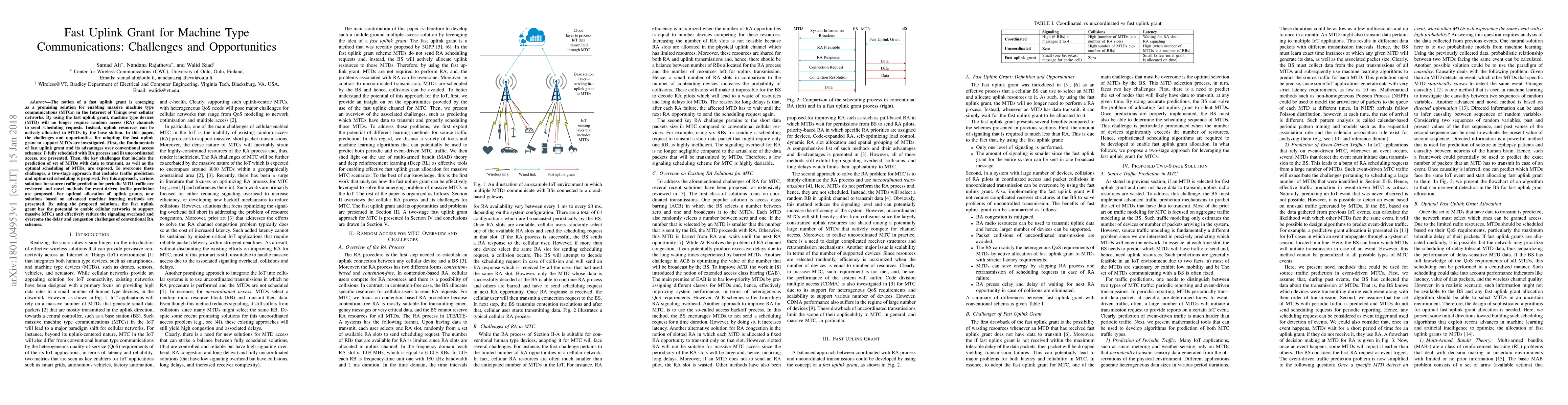 This paper explores the fast uplink grant as a solution for massive machine type communications in cellular networks, offering a fully scheduled alternative to the random access method. It investigates challenges such as predicting MTDs with data and optimal scheduling, proposing a two-stage approach with traffic prediction and machine learning-based scheduling to enhance network efficiency and reduce overhead.