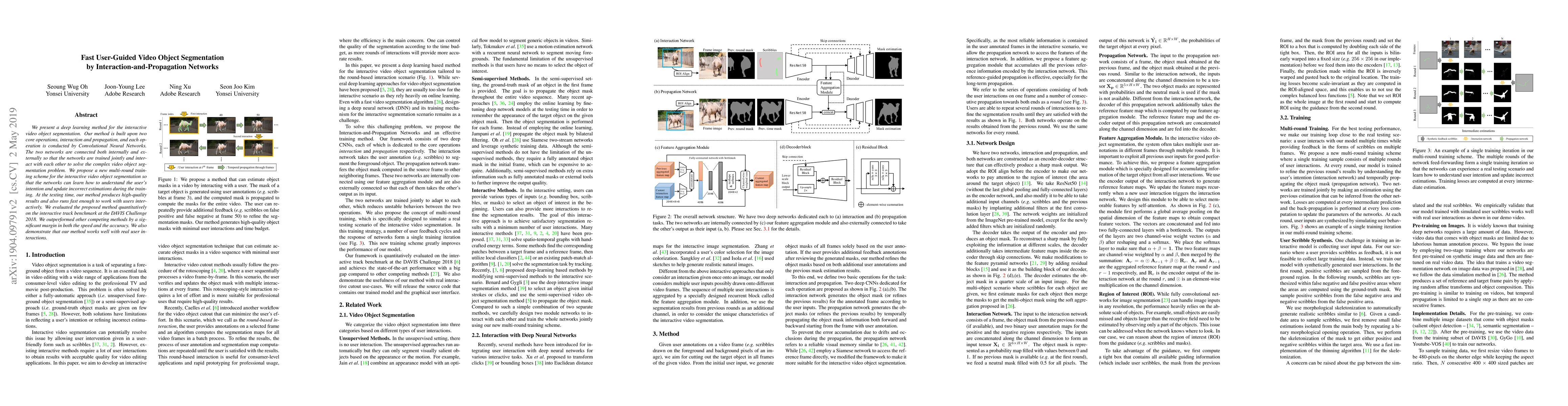 This paper introduces a deep learning method for interactive video object segmentation using interaction-and-propagation networks. The method combines two CNNs that are trained jointly to understand and update user inputs, achieving high-quality, fast segmentation results that outperformed other methods in the DAVIS Challenge 2018.
