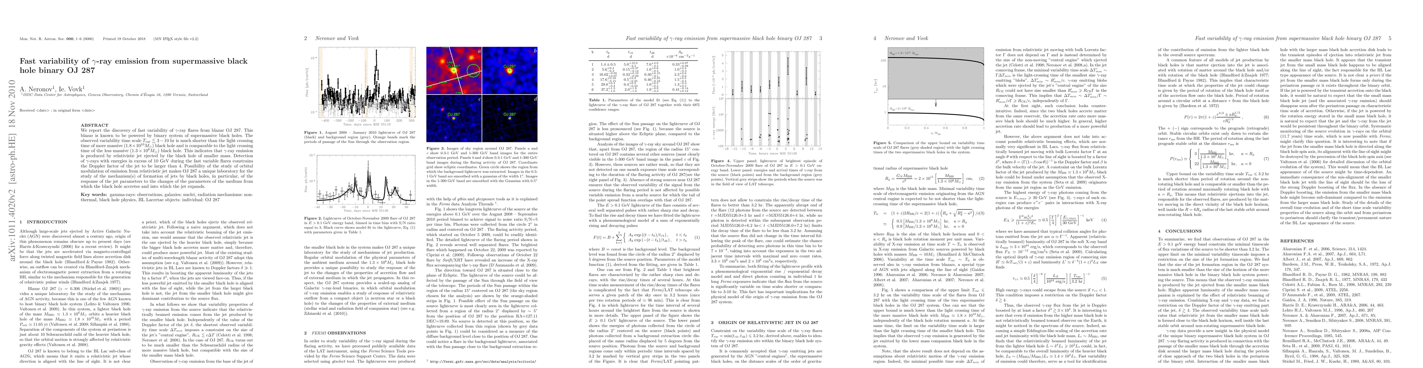 The research reports fast variability in gamma-ray flares from the blazar OJ 287, powered by a supermassive black hole binary system, with variability timescales shorter than the light crossing time of the more massive black hole. This suggests the gamma-ray emission originates from the relativistic jet of the smaller black hole, providing insights into jet formation mechanisms.