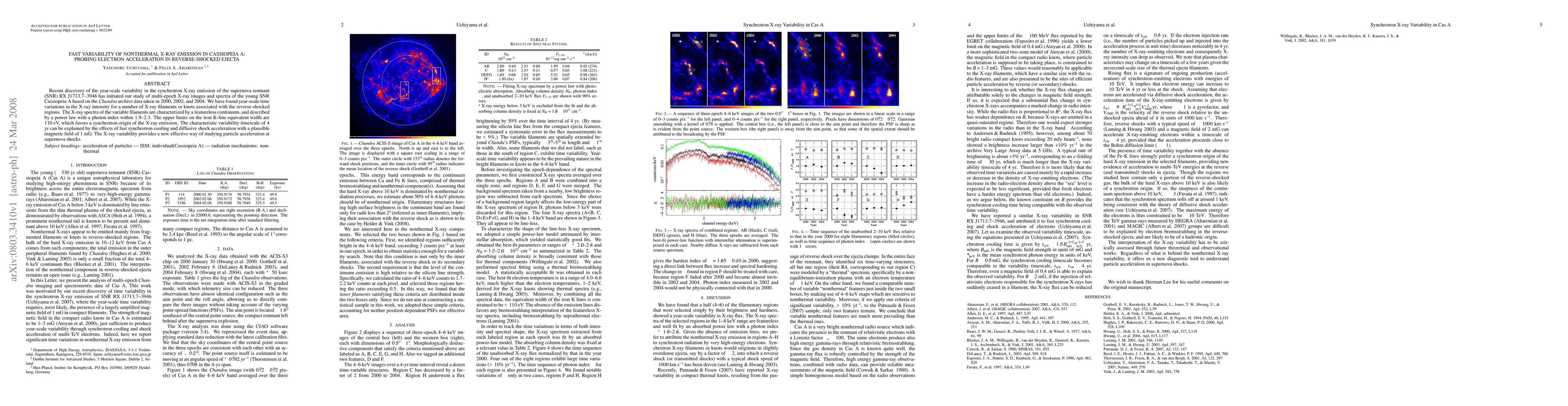 This study investigates year-scale variability in the X-ray emission from Cassiopeia A, revealing fluctuations in intensity in reverse-shocked regions. The findings suggest synchrotron emission driven by fast electron acceleration in the shock, offering insights into particle acceleration mechanisms in supernova remnants.