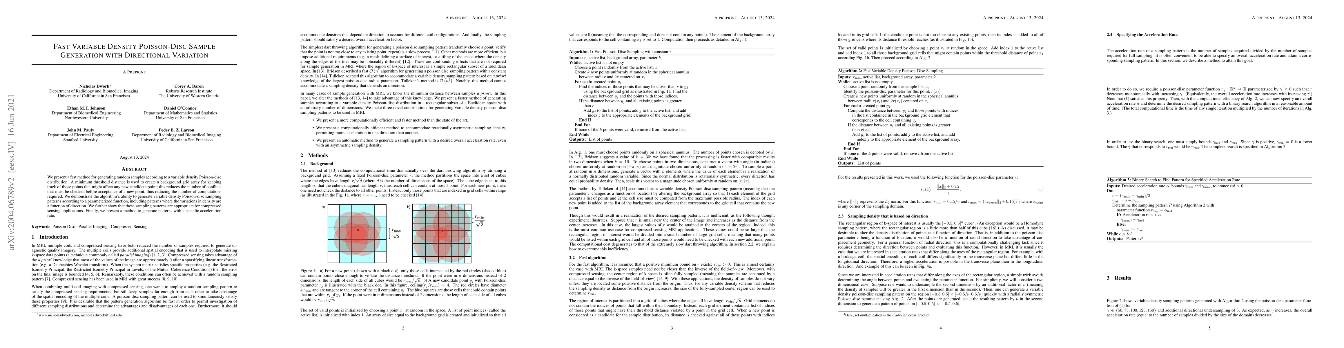 This paper introduces a rapid algorithm for generating Poisson-disc samples with variable density, utilizing a background grid to minimize computational conflicts. The method can create directional density variations and is suitable for compressed sensing applications, with an option to generate patterns with a specified acceleration rate.