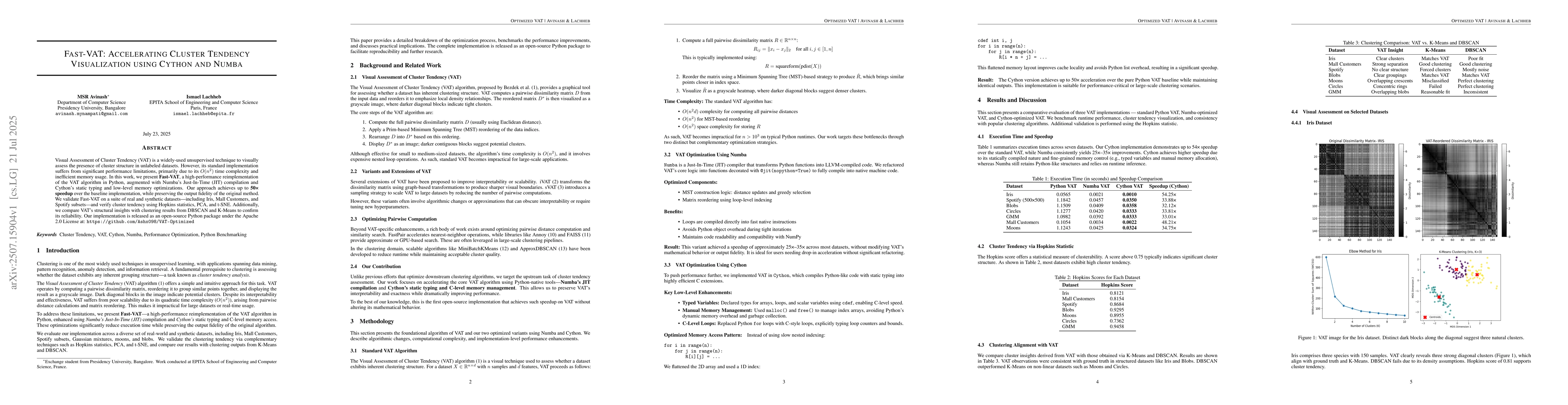 Visual Assessment of Cluster Tendency (VAT) is a widely used unsupervised technique to assess the presence of cluster structure in unlabeled datasets. However, its standard implementation suffers from significant performance limitations due to its O(n^2) time complexity and inefficient memory usage. In this work, we present Fast-VAT, a high-performance reimplementation of the VAT algorithm in Python, augmented with Numba's Just-In-Time (JIT) compilation and Cython's static typing and low-level memory optimizations. Our approach achieves up to 50x speedup over the baseline implementation, while preserving the output fidelity of the original method. We validate Fast-VAT on a suite of real and synthetic datasets -- including Iris, Mall Customers, and Spotify subsets -- and verify cluster tendency using Hopkins statistics, PCA, and t-SNE. Additionally, we compare VAT's structural insights with clustering results from DBSCAN and K-Means to confirm its reliability.