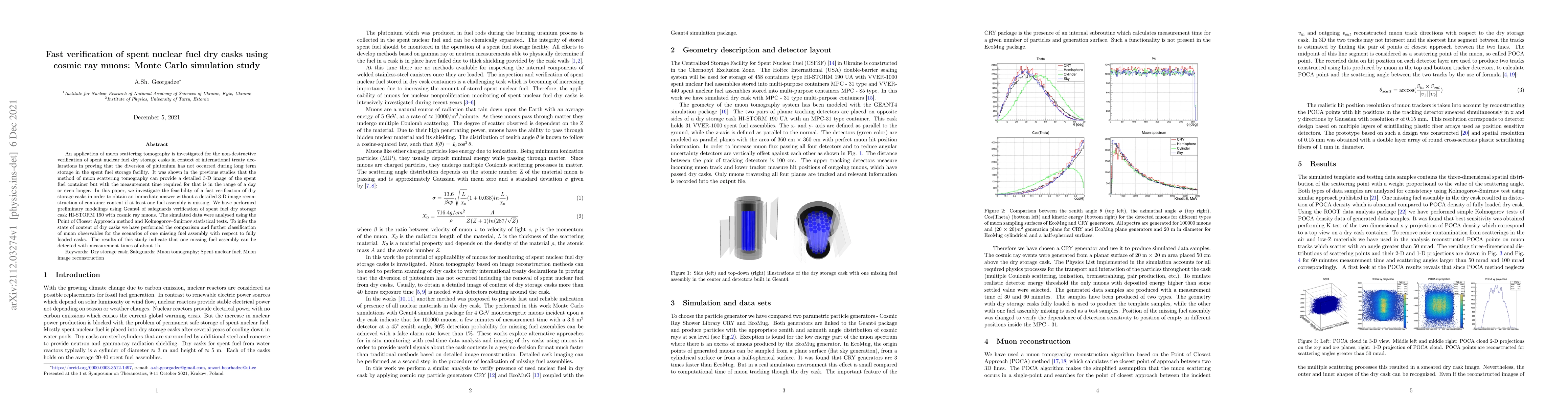 This paper explores the use of muon scattering tomography for fast verification of spent nuclear fuel dry casks, aiming to detect missing fuel assemblies within an hour without detailed 3-D reconstruction. Preliminary Monte Carlo simulations using Geant4 and statistical tests indicate the feasibility of this approach for non-destructive verification.