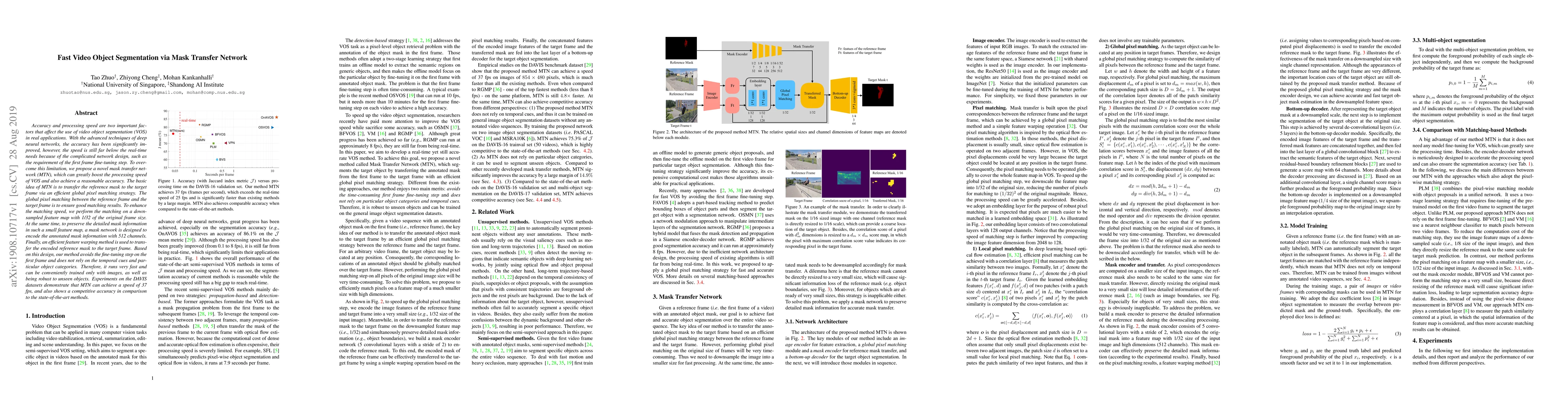 The paper proposes a Mask Transfer Network (MTN) to enhance the speed of video object segmentation (VOS) without sacrificing accuracy. MTN uses a global pixel matching strategy on downsampled feature maps and an efficient feature warping method to transfer reference masks, achieving 37 fps while maintaining competitive accuracy on DAVIS datasets.
