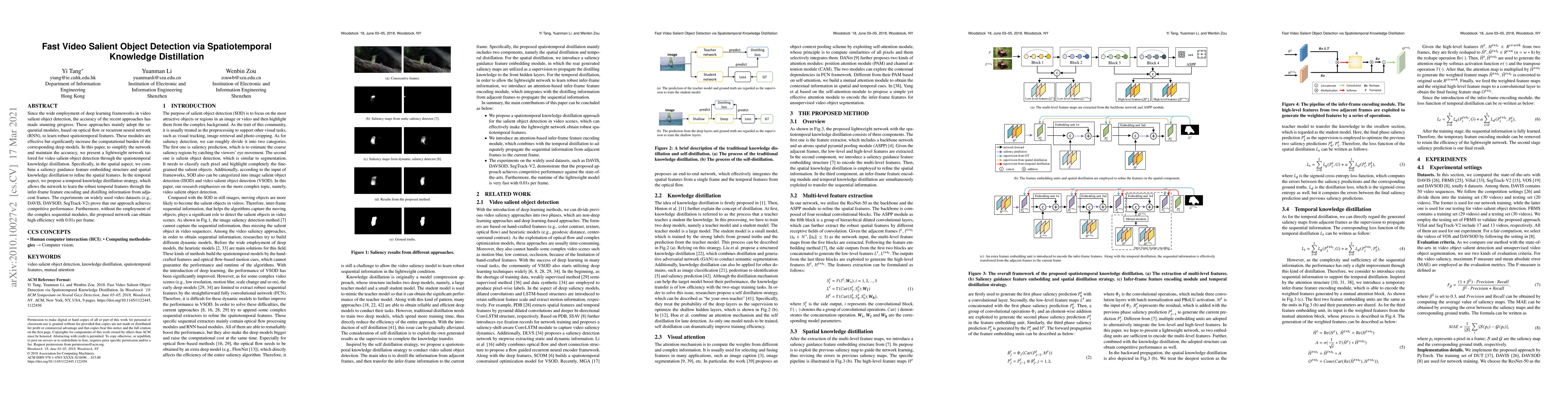 This paper proposes a lightweight network for fast video salient object detection using spatiotemporal knowledge distillation, achieving competitive accuracy while significantly reducing computational burden compared to sequential modules. The approach refines spatial features through spatial knowledge distillation and encodes temporal features via infer-frame feature encoding and temporal knowledge distillation, demonstrating high efficiency with 0.01s per frame.