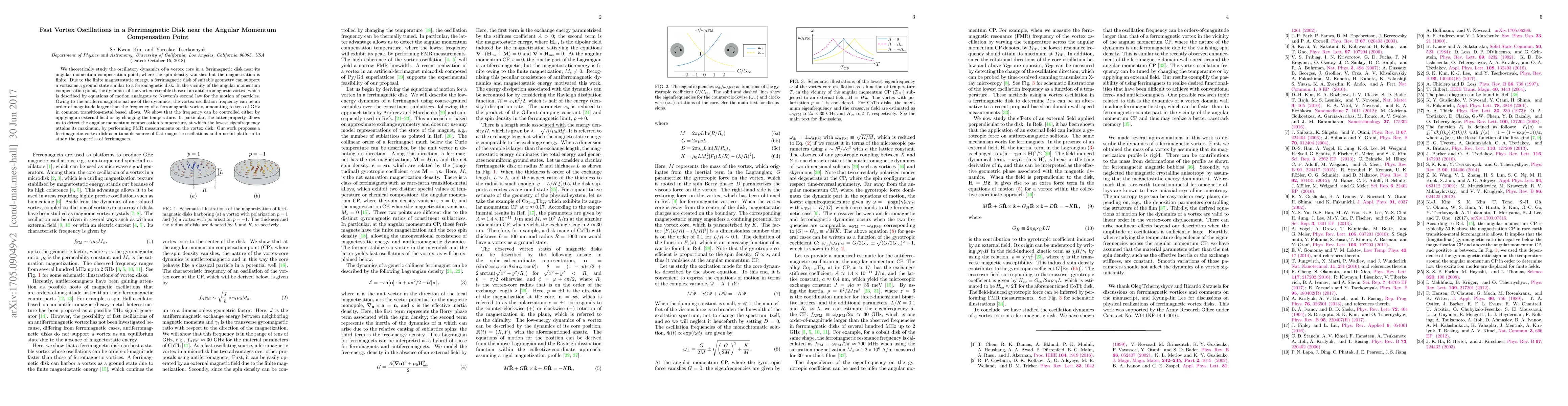 This paper theoretically investigates the oscillatory dynamics of a vortex core in a ferrimagnetic disk near its angular momentum compensation point, revealing high-frequency oscillations comparable to tens of GHz. The study proposes a ferrimagnetic vortex disk as a tunable source of fast magnetic oscillations and a platform for studying ferrimagnetic properties.