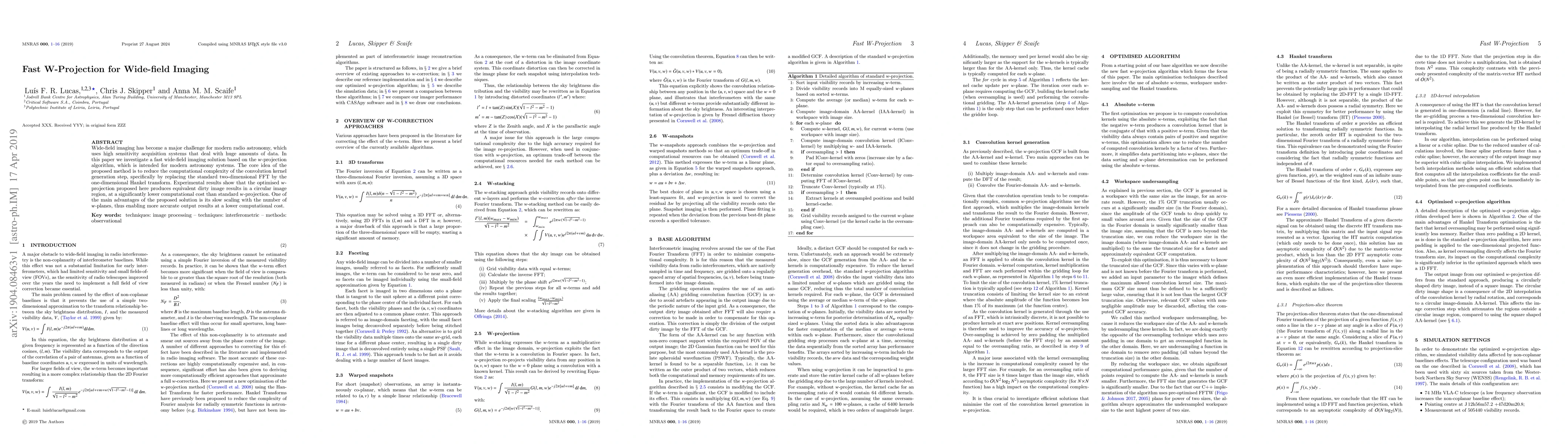 This paper proposes a fast wide-field imaging solution using an optimised w-projection algorithm, replacing the standard two-dimensional FFT with a one-dimensional Hankel transform to reduce computational complexity. The method scales slowly with the number of w-planes, achieving equivalent results at a significantly lower computational cost compared to standard methods.