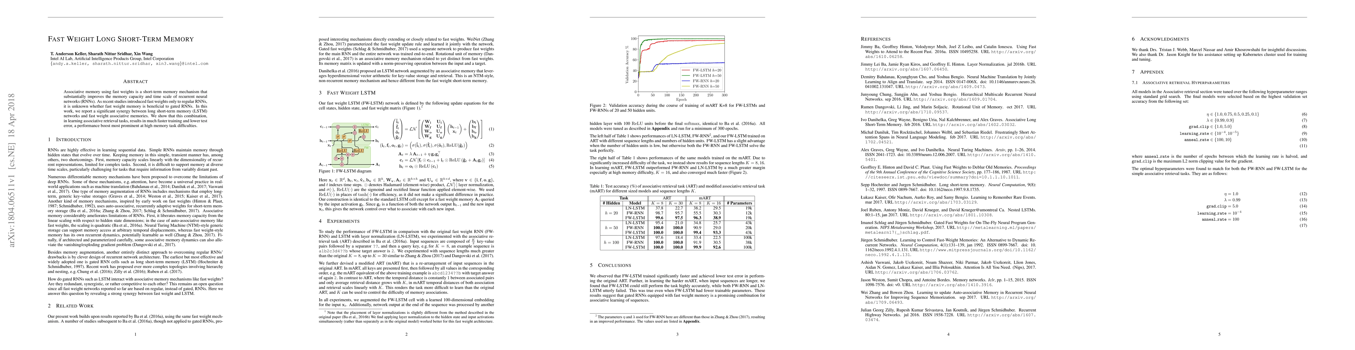 The paper introduces Fast Weight LSTM (FW-LSTM), an extension of LSTM networks incorporating fast weight associative memories, and evaluates it against original Fast Weight RNN (FW-RNN) and Layer Normalization LSTM (LN-LSTM) on associative retrieval tasks (ART and mART).