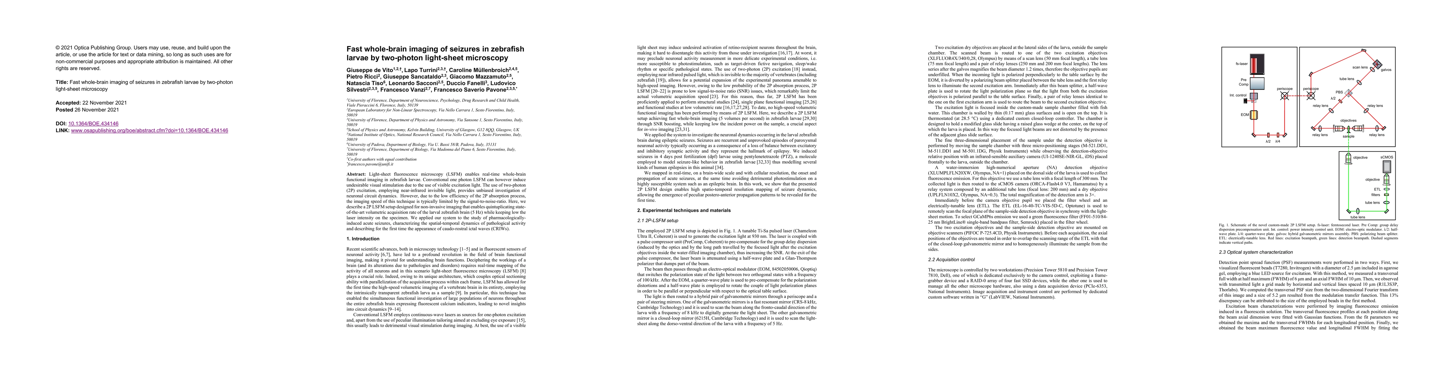 This paper presents a two-photon light-sheet microscopy setup that significantly enhances the imaging speed for whole-brain functional imaging in zebrafish larvae, achieving a 5 Hz acquisition rate while minimizing laser intensity. The method is used to study seizures, revealing caudo-rostral ictal waves for the first time.