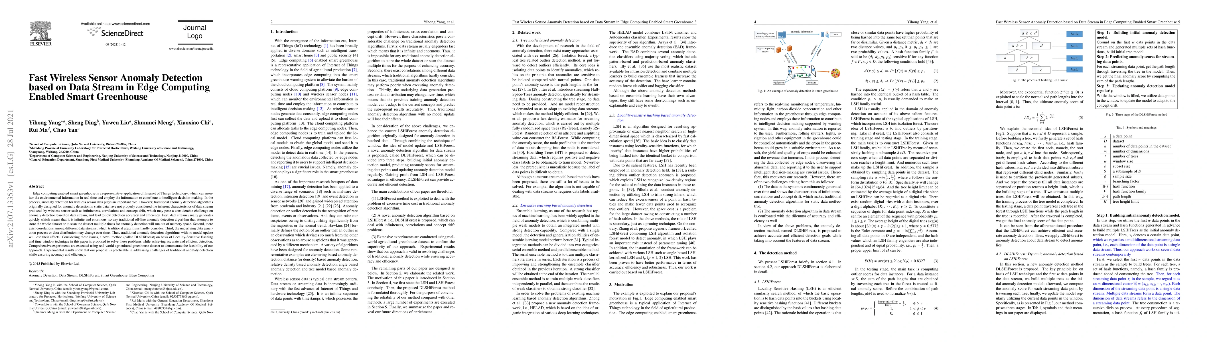 Edge computing enabled smart greenhouse is a representative application of Internet of Things technology, which can monitor the environmental information in real time and employ the information to contribute to intelligent decision-making. In the process, anomaly detection for wireless sensor data plays an important role. However, traditional anomaly detection algorithms originally designed for anomaly detection in static data have not properly considered the inherent characteristics of data stream produced by wireless sensor such as infiniteness, correlations and concept drift, which may pose a considerable challenge on anomaly detection based on data stream, and lead to low detection accuracy and efficiency. First, data stream usually generates quickly which means that it is infinite and enormous, so any traditional off-line anomaly detection algorithm that attempts to store the whole dataset or to scan the dataset multiple times for anomaly detection will run out of memory space. Second, there exist correlations among different data streams, which traditional algorithms hardly consider. Third, the underlying data generation process or data distribution may change over time. Thus, traditional anomaly detection algorithms with no model update will lose their effects. Considering these issues, a novel method (called DLSHiForest) on basis of Locality-Sensitive Hashing and time window technique in this paper is proposed to solve these problems while achieving accurate and efficient detection. Comprehensive experiments are executed using real-world agricultural greenhouse dataset to demonstrate the feasibility of our approach. Experimental results show that our proposal is practicable in addressing challenges of traditional anomaly detection while ensuring accuracy and efficiency.