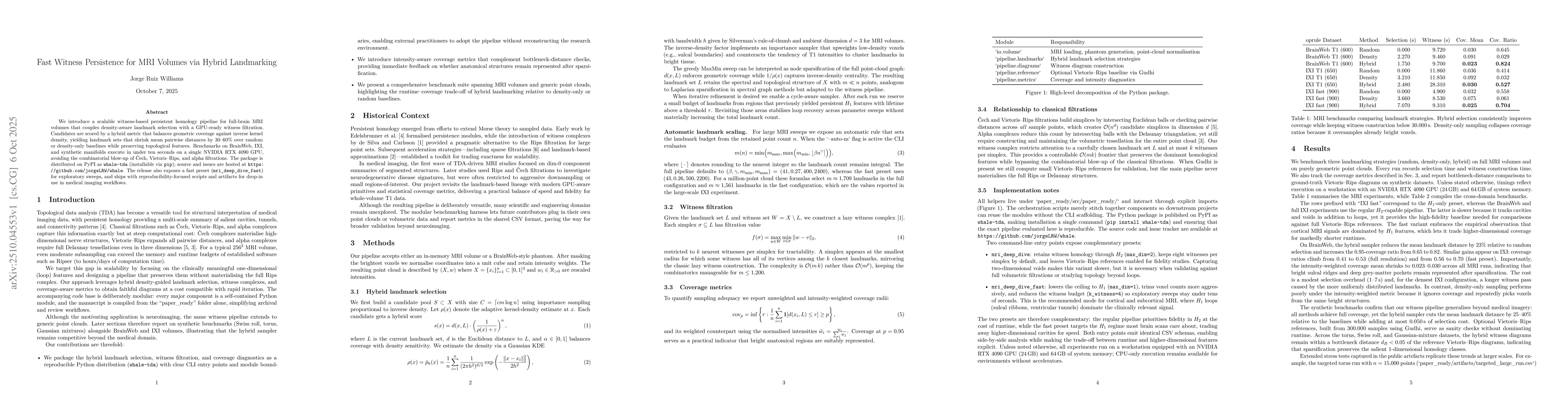 The research introduces a scalable witness-based persistent homology pipeline for MRI volumes, combining density-aware landmark selection with a GPU-ready witness filtration. A hybrid metric balances geometric coverage and inverse kernel density to select landmarks, and a greedy MaxMin sweep is used for sparse representation.