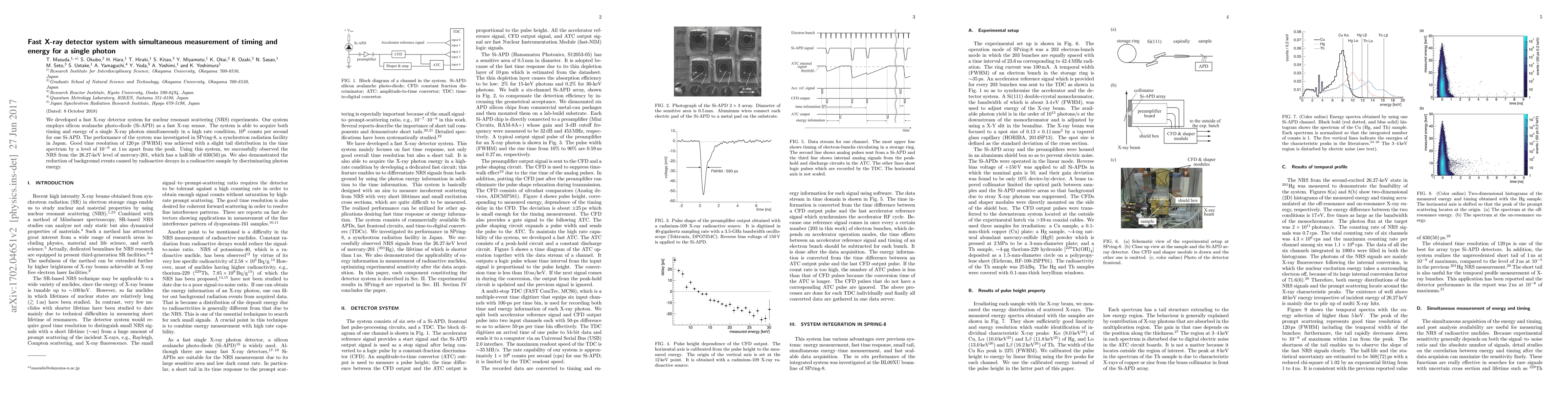 This paper presents a fast X-ray detector system using silicon avalanche photo-diode (Si-APD) for nuclear resonant scattering experiments, capable of simultaneous timing and energy measurement of single photons at a rate of $10^6$ counts per second. The system achieved a time resolution of 120 ps (FWHM) and successfully observed nuclear resonant scattering from mercury-201.