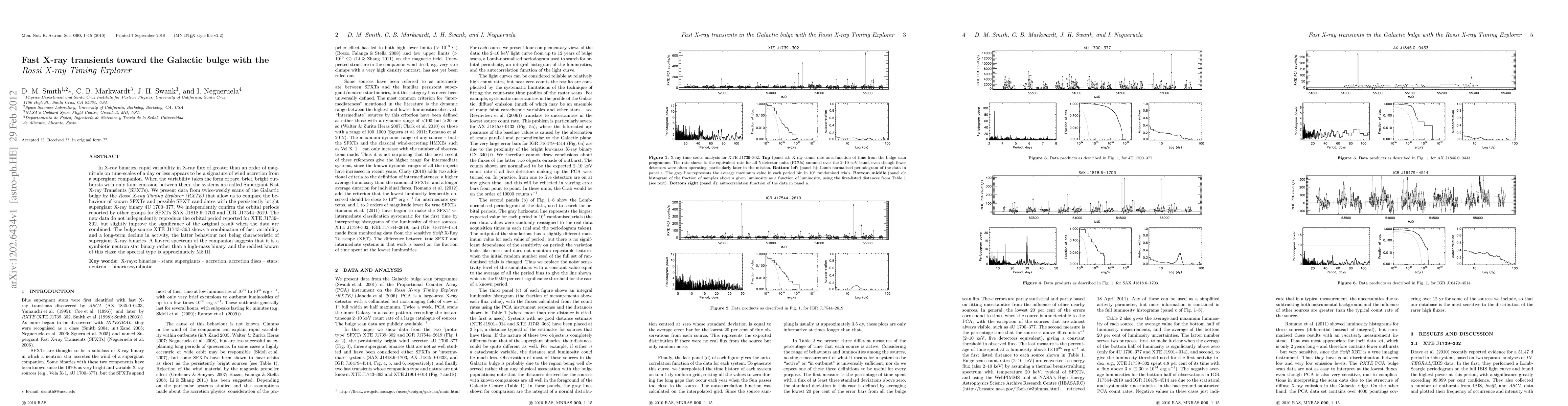 This paper reports on the detection and analysis of Supergiant Fast X-ray Transients (SFXTs) in the Galactic bulge using data from the Rossi X-ray Timing Explorer (RXTE). The study confirms the orbital periods of known SFXTs and identifies unusual variability in the source XTE J1743-363, suggesting it may be a symbiotic neutron star binary rather than a high-mass binary.