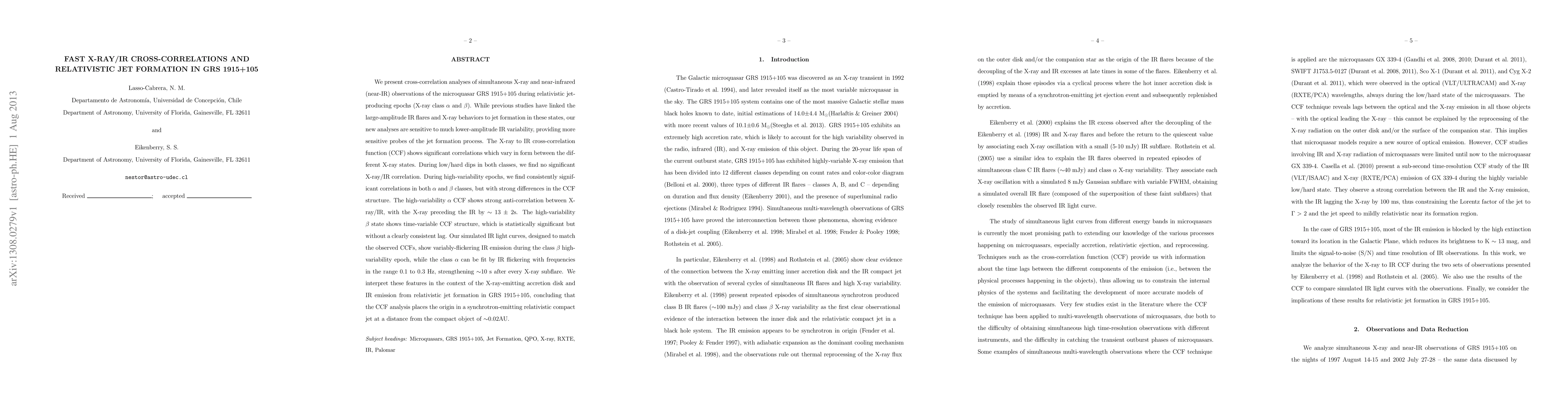 We present cross-correlation analyses of simultaneous X-ray and near-infrared (near-IR) observations of the microquasar GRS 1915+105 during relativistic jet-producing epochs (X-ray class $\alpha$ and $\beta$). While previous studies have linked the large-amplitude IR flares and X-ray behaviors to jet formation in these states, our new analyses are sensitive to much lower-amplitude IR variability, providing more sensitive probes of the jet formation process. The X-ray to IR cross-correlation function (CCF) shows significant correlations which vary in form between the different X-ray states. During low/hard dips in both classes, we find no significant X-ray/IR correlation. During high-variability epochs, we find consistently significant correlations in both $\alpha$ and $\beta$ classes, but with strong differences in the CCF structure. The high-variability $\alpha$ CCF shows strong anti-correlation between X-ray/IR, with the X-ray preceding the IR by $\sim$ 13 $\pm$ 2s. The high-variability $\beta$ state shows time-variable CCF structure, which is statistically significant but without a clearly consistent lag. Our simulated IR light curves, designed to match the observed CCFs, show variably-flickering IR emission during the class $\beta$ high-variability epoch, while the class $\alpha$ can be fit by IR flickering with frequencies in the range 0.1 to 0.3 Hz, strengthening $\sim$10 s after every X-ray subflare. We interpret these features in the context of the X-ray-emitting accretion disk and IR emission from relativistic jet formation in GRS 1915+105, concluding that the CCF analysis places the origin in a synchrotron-emitting relativistic compact jet at a distance from the compact object of $\sim$0.02AU.