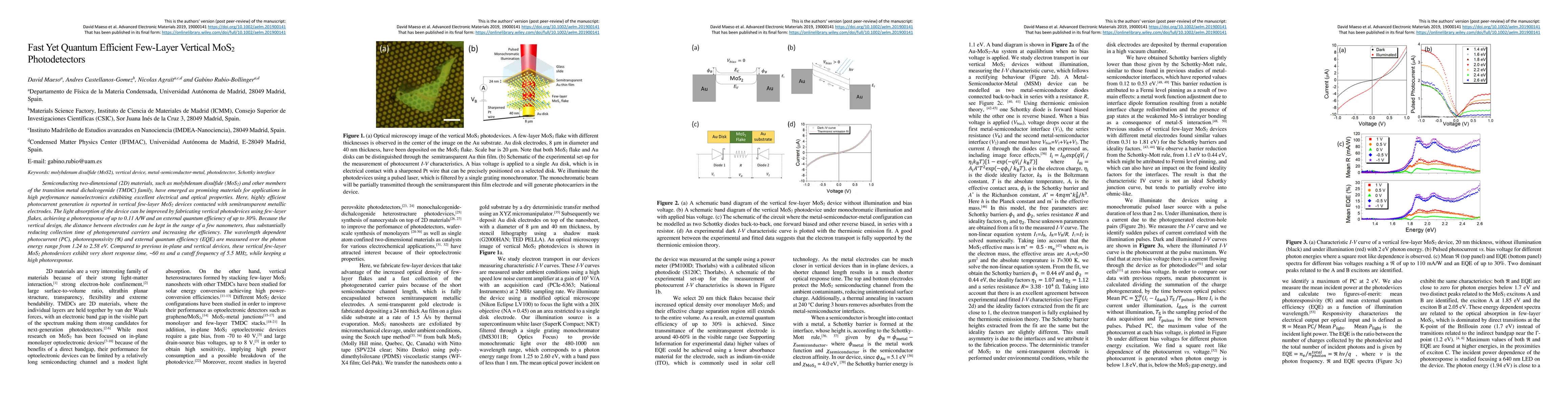 This study presents highly efficient few-layer vertical MoS2 photodetectors with excellent electrical and optical properties, achieving a photoresponse of 0.11 A/W and a quantum efficiency of 30%. The vertical design allows for rapid carrier collection, resulting in a short response time of 60 ns and a cutoff frequency of 5.5 MHz.