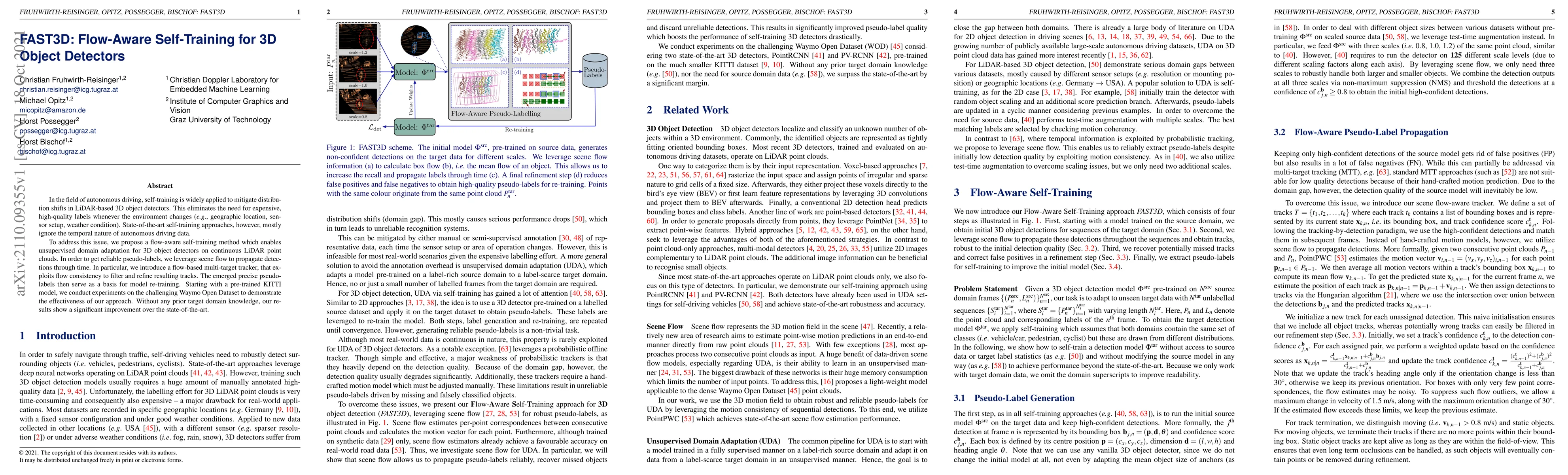 The paper proposes a flow-aware self-training method for 3D object detectors in autonomous driving, leveraging scene flow to propagate detections through time and improve model performance without high-quality labels. Experiments on the Waymo Open Dataset show significant improvements over existing state-of-the-art methods.
