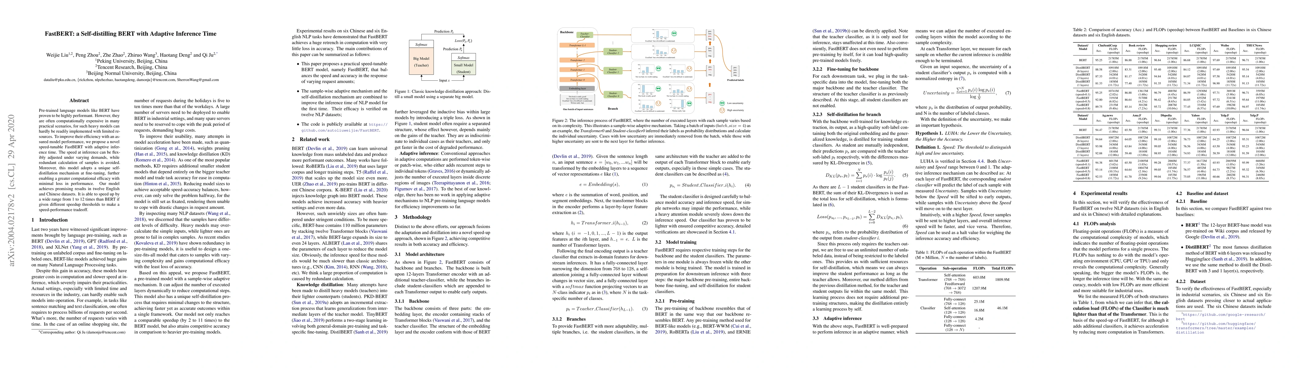 Pre-trained language models like BERT have proven to be highly performant. However, they are often computationally expensive in many practical scenarios, for such heavy models can hardly be readily implemented with limited resources. To improve their efficiency with an assured model performance, we propose a novel speed-tunable FastBERT with adaptive inference time. The speed at inference can be flexibly adjusted under varying demands, while redundant calculation of samples is avoided. Moreover, this model adopts a unique self-distillation mechanism at fine-tuning, further enabling a greater computational efficacy with minimal loss in performance. Our model achieves promising results in twelve English and Chinese datasets. It is able to speed up by a wide range from 1 to 12 times than BERT if given different speedup thresholds to make a speed-performance tradeoff.