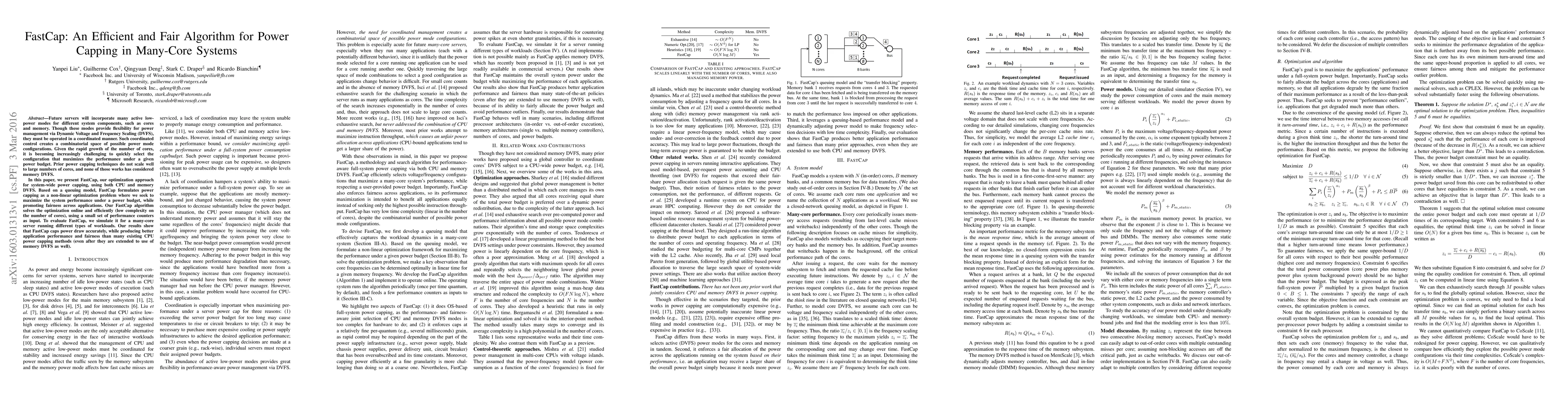 FastCap is an efficient algorithm for optimizing power capping in many-core systems using both CPU and memory DVFS, addressing the challenge of scaling power management to large numbers of cores. It achieves better performance and fairness compared to existing methods through an online optimization approach based on a queuing model.