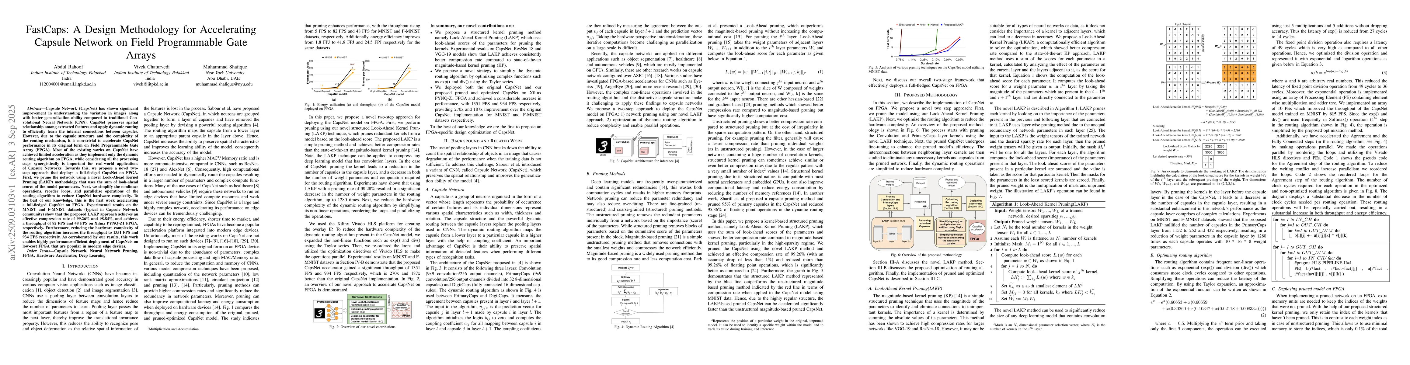 Capsule Network (CapsNet) has shown significant improvement in understanding the variation in images along with better generalization ability compared to traditional Convolutional Neural Network (CNN). CapsNet preserves spatial relationship among extracted features and apply dynamic routing to efficiently learn the internal connections between capsules. However, due to the capsule structure and the complexity of the routing mechanism, it is non-trivial to accelerate CapsNet performance in its original form on Field Programmable Gate Array (FPGA). Most of the existing works on CapsNet have achieved limited acceleration as they implement only the dynamic routing algorithm on FPGA, while considering all the processing steps synergistically is important for real-world applications of Capsule Networks. Towards this, we propose a novel two-step approach that deploys a full-fledged CapsNet on FPGA. First, we prune the network using a novel Look-Ahead Kernel Pruning (LAKP) methodology that uses the sum of look-ahead scores of the model parameters. Next, we simplify the nonlinear operations, reorder loops, and parallelize operations of the routing algorithm to reduce CapsNet hardware complexity. To the best of our knowledge, this is the first work accelerating a full-fledged CapsNet on FPGA. Experimental results on the MNIST and F-MNIST datasets (typical in Capsule Network community) show that the proposed LAKP approach achieves an effective compression rate of 99.26% and 98.84%, and achieves a throughput of 82 FPS and 48 FPS on Xilinx PYNQ-Z1 FPGA, respectively. Furthermore, reducing the hardware complexity of the routing algorithm increases the throughput to 1351 FPS and 934 FPS respectively. As corroborated by our results, this work enables highly performance-efficient deployment of CapsNets on low-cost FPGA that are popular in modern edge devices.