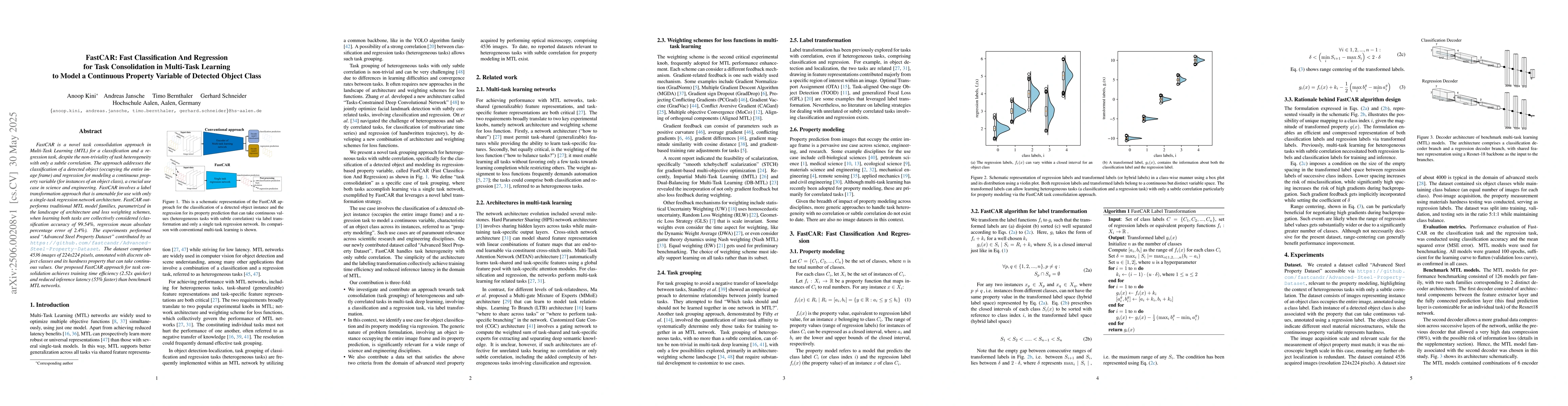FastCAR is a novel task consolidation approach in Multi-Task Learning (MTL) for a classification and a regression task, despite the non-triviality of task heterogeneity with only a subtle correlation. The approach addresses the classification of a detected object (occupying the entire image frame) and regression for modeling a continuous property variable (for instances of an object class), a crucial use case in science and engineering. FastCAR involves a label transformation approach that is amenable for use with only a single-task regression network architecture. FastCAR outperforms traditional MTL model families, parametrized in the landscape of architecture and loss weighting schemes, when learning both tasks are collectively considered (classification accuracy of 99.54%, regression mean absolute percentage error of 2.4%). The experiments performed used "Advanced Steel Property Dataset" contributed by us https://github.com/fastcandr/AdvancedSteel-Property-Dataset. The dataset comprises 4536 images of 224x224 pixels, annotated with discrete object classes and its hardness property that can take continuous values. Our proposed FastCAR approach for task consolidation achieves training time efficiency (2.52x quicker) and reduced inference latency (55% faster) than benchmark MTL networks.