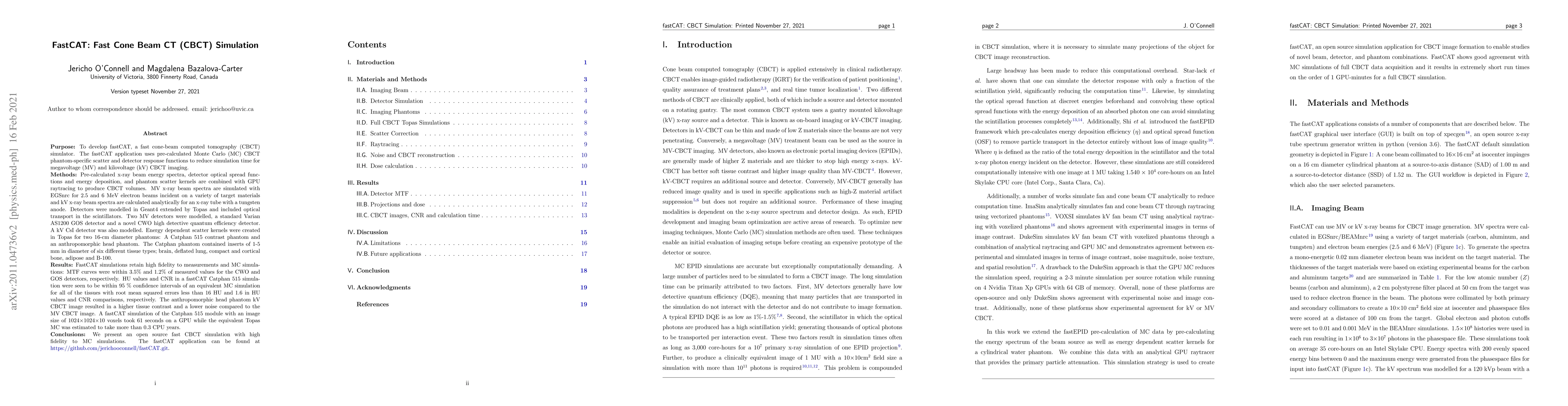 The fastCAT application uses pre-calculated Monte Carlo (MC) CBCT phantom-specific scatter and detector response functions to reduce simulation time for megavoltage (MV) and kilovoltage (kV) CBCT imaging. Pre-calculated x-ray beam energy spectra, detector optical spread functions and energy deposition, and phantom scatter kernels are combined with GPU raytracing to produce CBCT volumes. MV x-ray beam spectra are simulated with EGSnrc for 2.5 and 6 MeV electron beams incident on a variety of target materials and kV x-ray beam spectra are calculated analytically for an x-ray tube with a tungsten anode. Detectors were modelled in Geant4 extended by Topas and included optical transport in the scintillators. Two MV detectors were modelled, a standard Varian AS1200 GOS detector and a novel CWO high detective quantum efficiency detector. A kV CsI detector was also modelled. Energy dependent scatter kernels were created in Topas for two 16-cm diameter phantoms: A Catphan 515 contrast phantom and an anthropomorphic head phantom. The Catphan phantom contained inserts of 1-5 mm in diameter of six different tissue types. FastCAT simulations retain high fidelity to measurements and MC simulations: MTF curves were within 3.5% and 1.2% of measured values for the CWO and GOS detectors, respectively. HU values and CNR in a fastCAT Catphan 515 simulation were seen to be within 95 % confidence intervals of an equivalent MC simulation for all of the tissues with root mean squared errors less than 16 HU and 1.6 in HU values and CNR comparisons, respectively. A fastCAT simulation of the Catphan 515 module with an image size of 1024x1024x10 voxels took 61 seconds on a GPU while the equivalent Topas MC was estimated to take more than 0.3 CPU years. The fastCAT application can be found at https://github.com/jerichooconnell/fastCATs.git.