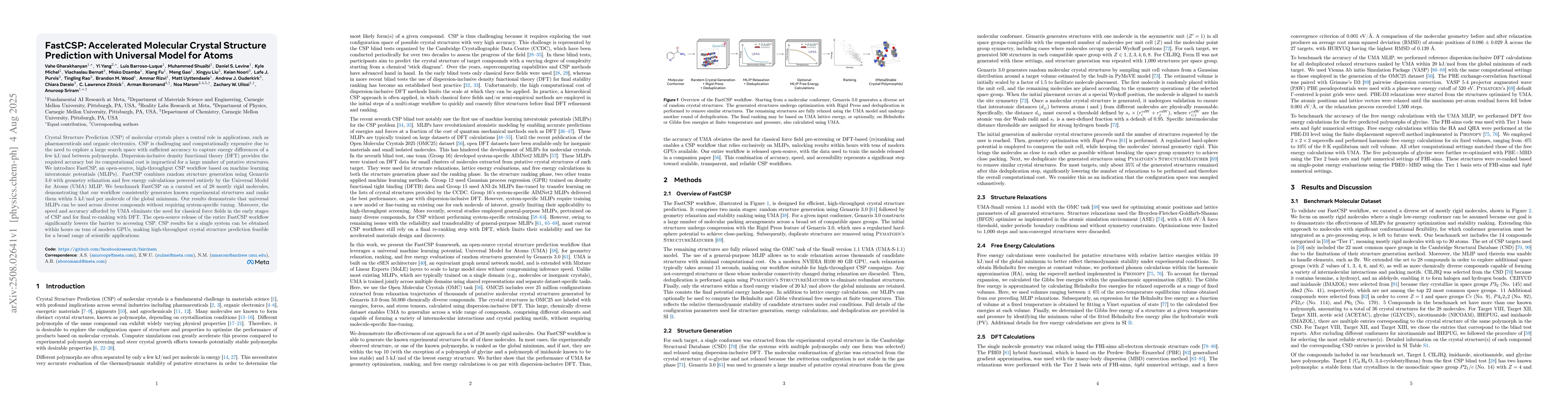 Crystal Structure Prediction (CSP) of molecular crystals plays a central role in applications, such as pharmaceuticals and organic electronics. CSP is challenging and computationally expensive due to the need to explore a large search space with sufficient accuracy to capture energy differences of a few kJ/mol between polymorphs. Dispersion-inclusive density functional theory (DFT) provides the required accuracy but its computational cost is impractical for a large number of putative structures. We introduce FastCSP, an open-source, high-throughput CSP workflow based on machine learning interatomic potentials (MLIPs). FastCSP combines random structure generation using Genarris 3.0 with geometry relaxation and free energy calculations powered entirely by the Universal Model for Atoms (UMA) MLIP. We benchmark FastCSP on a curated set of 28 mostly rigid molecules, demonstrating that our workflow consistently generates known experimental structures and ranks them within 5 kJ/mol per molecule of the global minimum. Our results demonstrate that universal MLIPs can be used across diverse compounds without requiring system-specific tuning. Moreover, the speed and accuracy afforded by UMA eliminate the need for classical force fields in the early stages of CSP and for final re-ranking with DFT. The open-source release of the entire FastCSP workflow significantly lowers the barrier to accessing CSP. CSP results for a single system can be obtained within hours on tens of modern GPUs, making high-throughput crystal structure prediction feasible for a broad range of scientific applications.