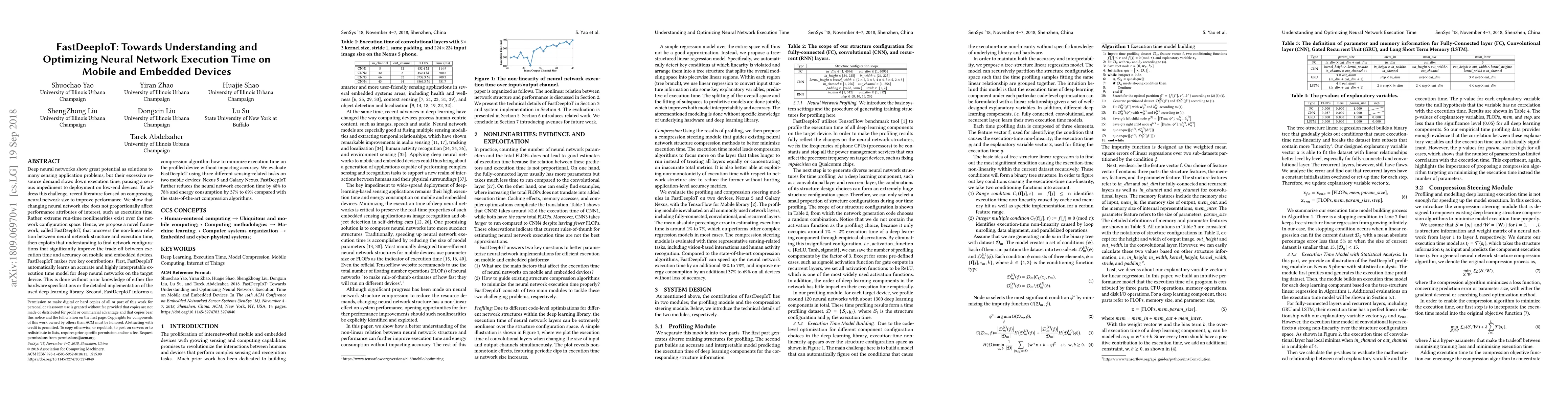 FastDeepIoT presents a framework to optimize neural network execution time on mobile and embedded devices by identifying nonlinear relationships between network structure and performance. It automatically learns an execution time model and guides compression to minimize runtime without sacrificing accuracy, achieving up to 78% reduction in execution time and 69% in energy consumption.