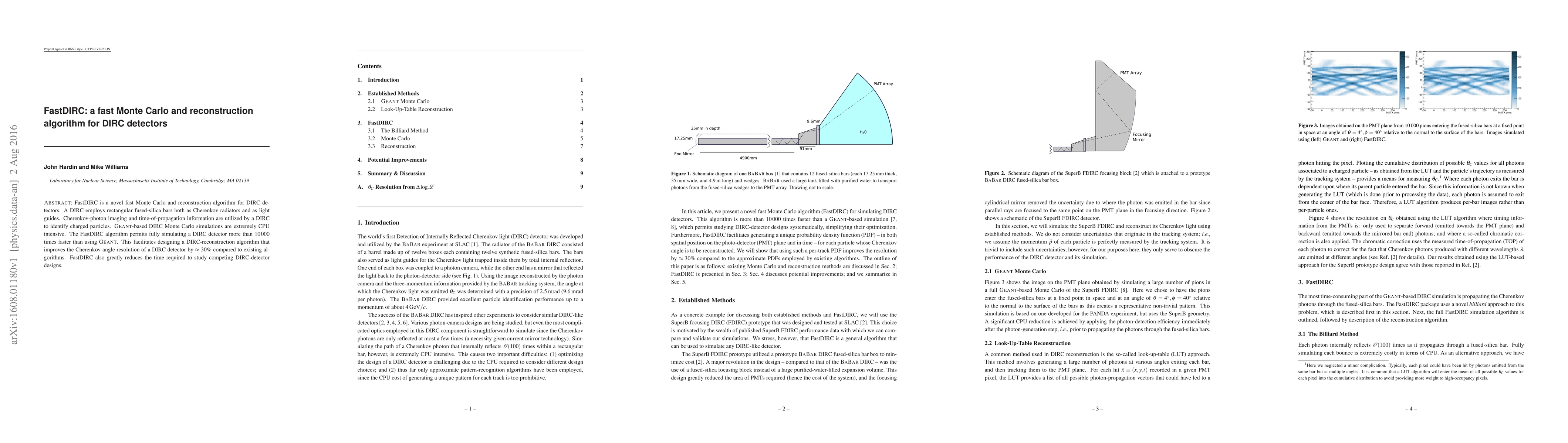 FastDIRC is a highly efficient Monte Carlo and reconstruction algorithm for DIRC detectors, significantly speeding up simulations by over 10,000 times compared to GEANT. It enhances Cherenkov-angle resolution by approximately 30% and accelerates the evaluation of DIRC-detector designs.