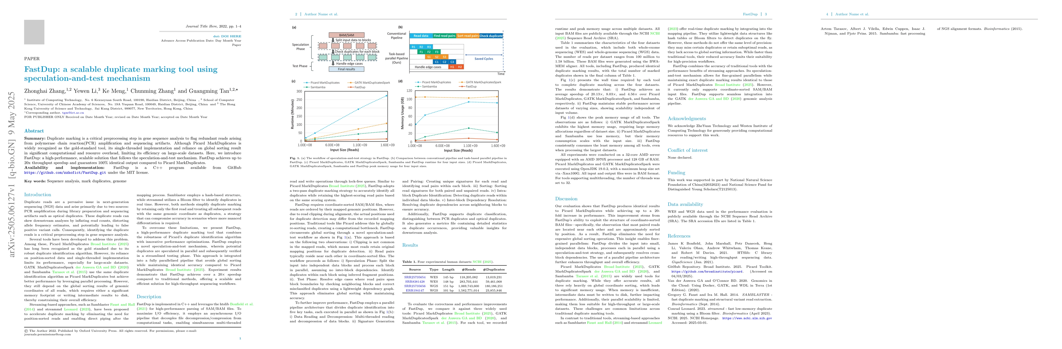 The paper introduces FastDup, a C++ program following the speculation-and-test mechanism for duplicate marking in gene sequence analysis, aiming to improve upon Picard MarkDuplicates' efficiency.