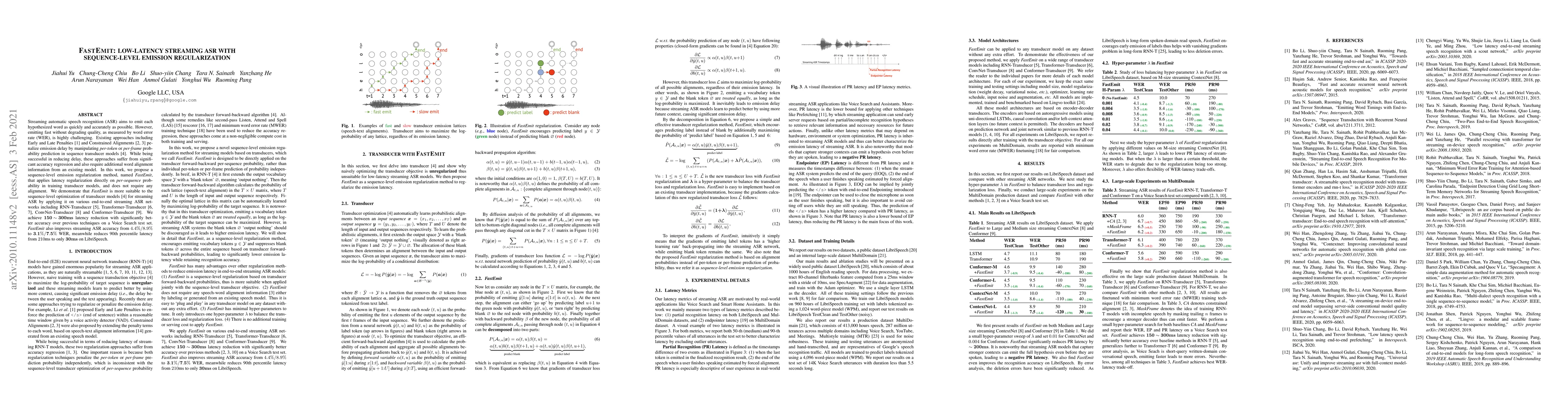FastEmit introduces a sequence-level emission regularization method for low-latency streaming ASR, achieving significant latency reduction without requiring additional word alignment information. It improves accuracy and reduces the 90th percentile latency from 210 ms to 30 ms on LibriSpeech.
